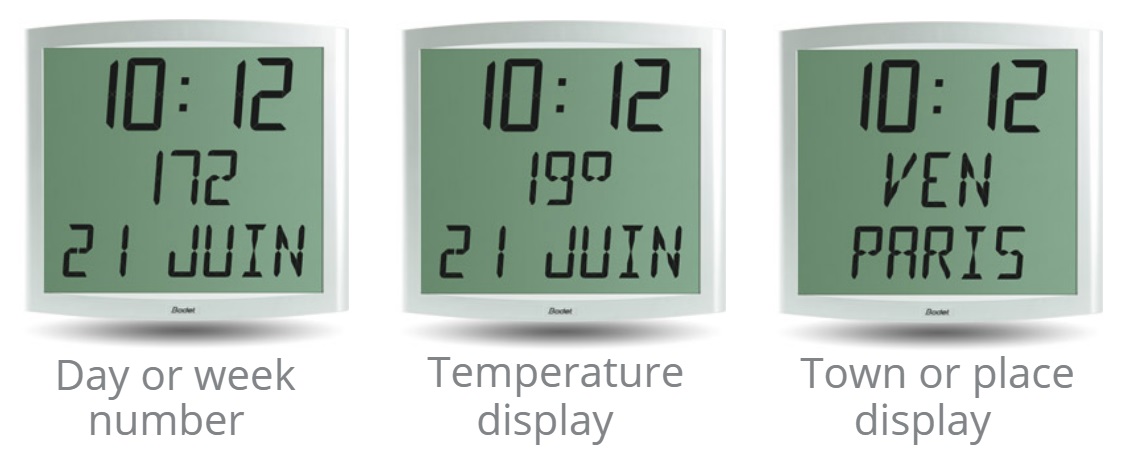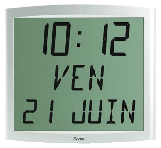 BODET CRISTALYS DATE (938241x) – вторичные цифровые часы от компании BODET, синхронизация которых выполняется по радиосигналу от DCF передатчика. Качественный LCD дисплей с высокой яркостью и углом обзора 160° обеспечивает отличную видимость и читаемость транслируемой информации с расстояния до 25 м, а встроенный кварцевый механизм в сочетании с регулярной синхронизацией гарантируют высокую точность и стабильность работы устройства. Информация на дисплей выводится в 3-х строках, при этом в первой всегда отображается время (12/24 ч на выбор), в 2-х других можно установить трансляцию секунд, температуры, дня недели, № дня или недели, даты, обратного отсчета времени или названия города. Часы выпускаются в экстра плоском корпусе из ABS пластика в 3-х вариантах цвета (алюминиевый, бордовый, белый). Питание реализовано от 4-х сменных АКБ типа LR 14, для экономии энергии предусмотрена функция энергосбережения.