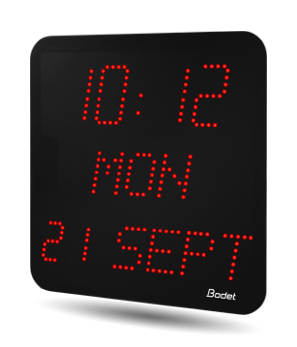 STYLE II 7 D (946621A) - это вторичные цифровые часы-календарь от ведущей компании BODET. Данная модель часов синхронизируется с управляющими мастер-часами поляризованными импульсами +24 В. Она оснащена ярким точечным LED-дисплеем, время на котором отображается в двух режимах: 12 часов или 24 часа (на выбор). Дополнительно часы отображают день недели, дату и месяц. Также имеется функция комбинированного режима отображаемой информации: секунды, номер недели или температура. Для отображения температуры в часах имеется встроенный датчик температуры. Плюс ко всему данная модель поддерживает 14 предустановленных языков с возможностью отображения информации на 2-х выбранных. Дисплей имеет 4-уровневую регулировку яркости. Высота цифровых символов составляет 7 см, а буквенных - 5 см. Цвет отображаемых символов красный. Особым преимуществом данной модели является память хранения данных (в случае сбоя питания) до 15 дней. Средняя точность составляет ±0.2 секунды в сутки. Дополнительно часы поддерживают автоматическое переключение с летнего времени на зимнее (и наоборот), а также имеют вечный автоматический календарь. Питание осуществляется от сети ~110 - 230 В. Плюс ко всему часы обладают повышенной степенью влагозащиты класса IP55.
