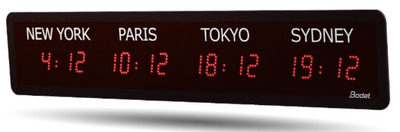 Данная модель предназначена для использования внутри помещения. Размер цифр составляет 50 мм, что позволяет считать информацию на расстоянии до 20 м. Обратите внимание, название городов (регионов) нельзя изменить с помощью клавиш меню, поскольку буквы наклеены на корпус часов. Табло мирового времени BODET WORLD STYLE имеет ряд конфигураций с различными характеристиками, а также за счет опциональных интерфейсов синхронизации можно подобрать необходимый вариант.
