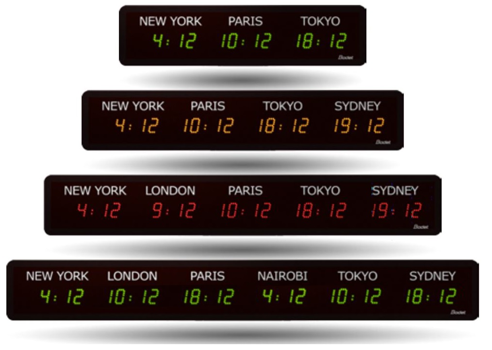 Данная модель предназначена для использования внутри помещения. Размер цифр составляет 50 мм, что позволяет считать информацию на расстоянии до 20 м. Обратите внимание, название городов (регионов) нельзя изменить с помощью клавиш меню, поскольку буквы наклеены на корпус часов. Табло мирового времени BODET WORLD STYLE имеет ряд конфигураций с различными характеристиками, а также за счет опциональных интерфейсов синхронизации можно подобрать необходимый вариант.