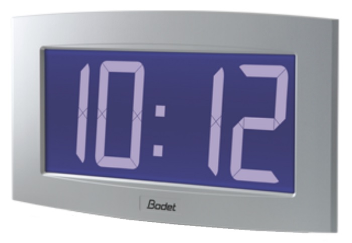 OPALYS 14 (938642A) – вторичные цифровые часы от компании BODET, синхронизация которых выполняется по радиосигналу от DHF передатчика. Они снабжены качественным LCD дисплеем с яркой синей подсветкой и символами высотой 14 см, что в сочетании с углом обзора в 160° обеспечивает отличную видимость и читабельность информации с любой точки помещения длиной до 60 м. На дисплей выводится время (12/24 ч на выбор), дата, № недели, год и температура, при этом есть возможность установить трансляцию только времени или же поочередное отображение времени и других доступных параметров. Часы выпускаются в экстра плоском корпусе из ABS пластика алюминиевого цвета, и могут крепиться на стену и потолок или же устанавливаться на настольную подставку. Питание реализовано от сети AC 230 В через комплектный адаптер, для экономии энергии предусмотрена функция энергосбережения.