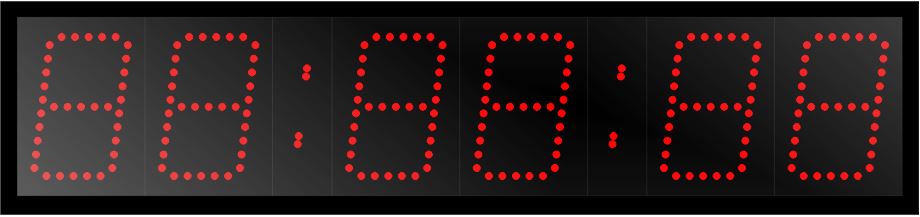 Дисплей часов создан на основе светодиодов SMD 3528 с чипом Epistar, которые размещены на светодиодной секции в один ряд и создают шесть (6) знаков высотой 100 мм, видные на расстоянии до 30 метров. Угол половины яркости устройства = 60˚. Если требуется подстройка яркости в зависимости от фонового освещения, приобретается соответствующий блок. Цвет светодиодов определяется при заказе и может быть красным, зелёным, жёлтым, синим или белым.