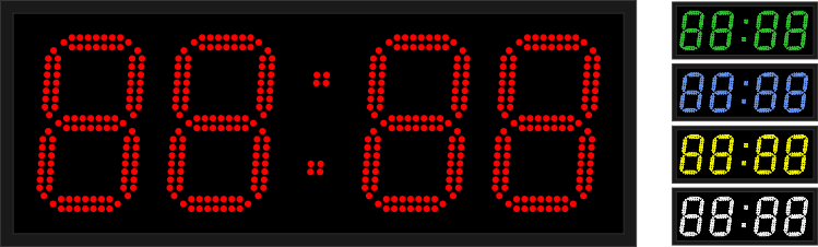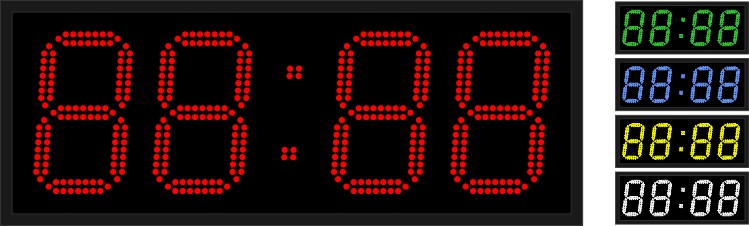 Дисплей часов создан на основе светодиодов SMD 3528 с чипом Epistar, которые размещены на светодиодной секции в два ряда и создают четыре (4) знака высотой 210мм, видные на расстоянии до 80 метров. Угол половины яркости устройства = 60˚. Если требуется подстройка яркости в зависимости от фонового освещения, приобретается соответствующий блок. Цвет светодиодов определяется при заказе и может быть красным, зелёным, жёлтым, синим или белым.