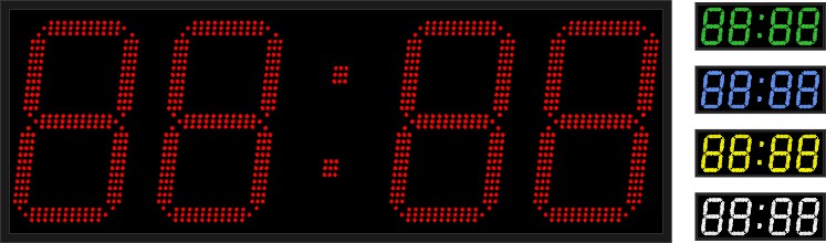 Дисплей часов создан на основе светодиодов SMD 3528 с чипом Epistar, которые размещены на светодиодной секции в три ряда и создают четыре (4) знака высотой 350мм, видные на расстоянии до 150 метров. Угол половины яркости устройства = 60˚. Если требуется подстройка яркости в зависимости от фонового освещения, приобретается соответствующий блок. Цвет светодиодов определяется при заказе и может быть красным, зелёным, жёлтым, синим или белым.
