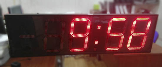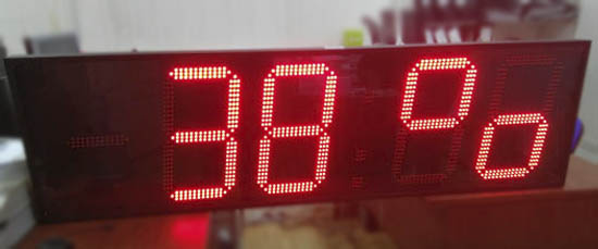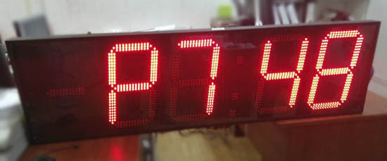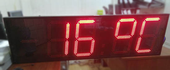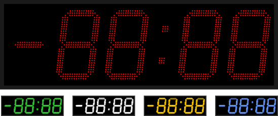 Дисплей часов создан на основе светодиодов SMD 3528 с чипом Epistar с диаметром 5 мм, которые размещены на светодиодной секции в три ряда и создают четыре (4) знака высотой 350 мм, видные на расстоянии до 150 метров. Угол половины яркости устройства = 60˚. Если требуется подстройка яркости в зависимости от фонового освещения, приобретается соответствующий блок. Цвет светодиодов определяется при заказе и может быть красным, зелёным, жёлтым, синим или белым.