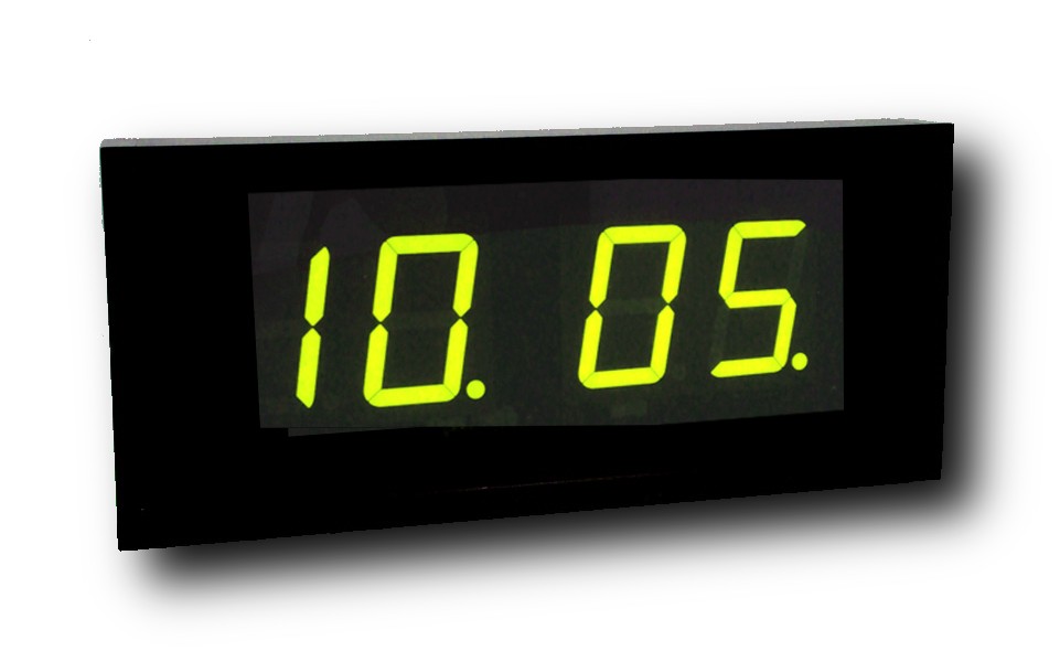 Дисплей часов создан на основе семисегментных светодиодных индикаторов; на нем помещается четыре (4) знака высотой сто (100) мм. Цвет цифр в данном исполнении желтый. Хорошая видимость информации на часах с расстояния до пятидесяти (50) метров. Возможна настройка часовых поясов и автоматического перехода на сезонное время.