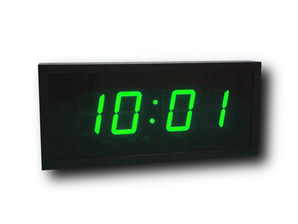 Дисплей часов создан на основе семисегментных светодиодных индикаторов; на нем помещается четыре (4) знака высотой сто (100) мм. Цвет цифр в данном исполнении зеленый. Хорошая видимость информации на часах с расстояния до пятидесяти (50) метров. Возможна настройка часовых поясов и автоматического перехода на сезонное время.