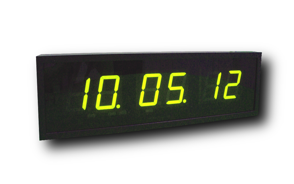 Дисплей часов создан на основе семисегментных светодиодных индикаторов; на нем помещается шесть (6) знаков высотой сто (100) мм. Цвет цифр в данном исполнении желтый. Хорошая видимость информации на часах с расстояния до пятидесяти (50) метров. Возможна настройка часовых поясов и автоматического перехода на сезонное время.