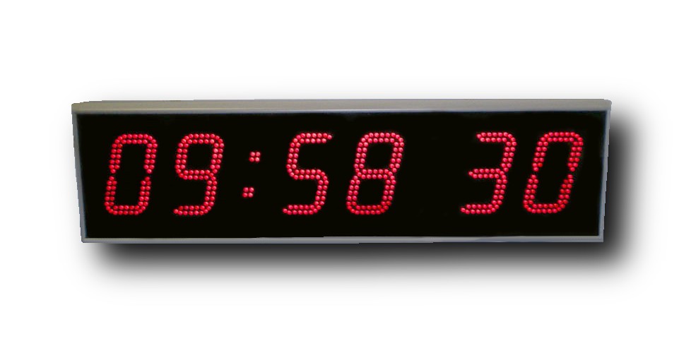 Дисплей часов создан на основе точечных светодиодов; на нем помещается шесть (6) знаков высотой двести сорок (240) мм. Цвет цифр в данном исполнении красный. Хорошая видимость информации на часах с расстояния до ста пятидесяти (150) метров. Возможна настройка часовых поясов и автоматического перехода на сезонное время.