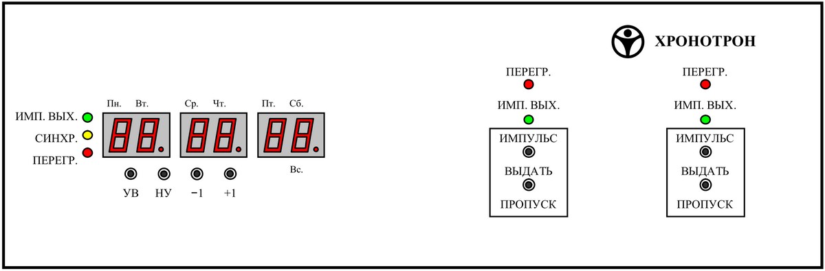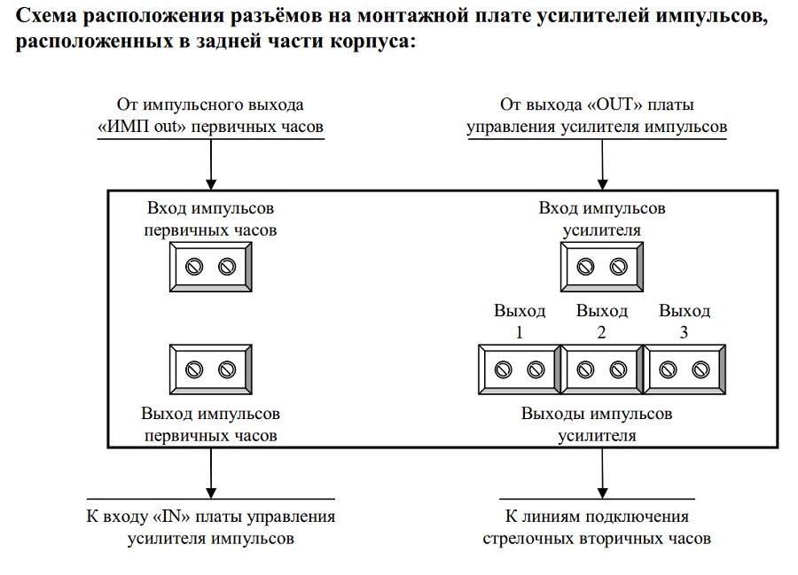 Дефолтно усилитель работает как ретранслятор импульсов точного времени от первичных часов на вторичные, а если требуется иной режим работы, то возможна подача доп. импульсов от самого усилителя, или пропуск импульсов поступающих от первичных часов. Есть ручное управление усилителем кнопками на лицевой части прибора
