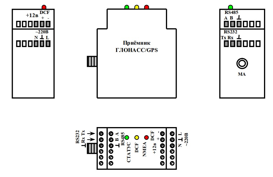 Устройство состоит из двух блоков - приемника, расположенного в телекоммуникационном шкафу/боксе на DIN-рейке и выносной антенне на магните, которая подключается к П-СВ2 коаксиальным кабелем длиной пять (5) метров. Антенна обеспечивает надежный качественный прием данных от спутника, особенно если установлена перпендикулярно плоскости установки.