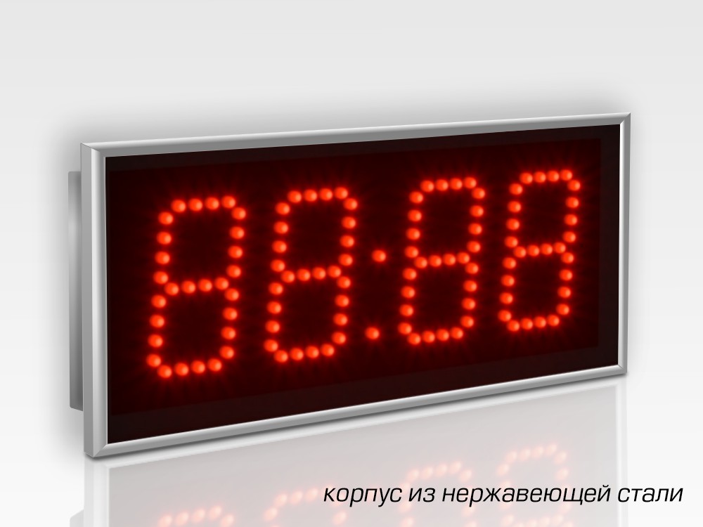 Водонепроницаемый корпус из шлифованной нержавеющей стали, декоративный профиль из анодированного алюминия и акриловое стекло защищающее лицевую панель. Корпус устойчив к воздействию любых типов моющих/чистящих средств, ультрафиолета и агрессивных сред. Часы не выделяют тепла и загрязнений и не накапливают заряды электростатического электричества. Габаритные размеры 320x140 мм. Питание от сети переменного тока 220В/50Гц. Рабочий ресурс часов составляет 100 000 часов.
