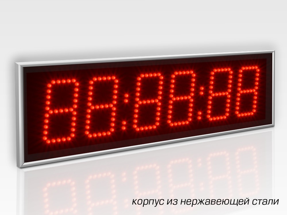 Водонепроницаемый корпус из шлифованной нержавеющей стали, декоративный профиль из анодированного алюминия и акриловое стекло защищающее лицевую панель. Корпус устойчив к воздействию любых типов моющих/чистящих средств, ультрафиолета и агрессивных сред. Часы не выделяют тепла и загрязнений и не накапливают заряды электростатического электричества. Габаритные размеры 560x160 мм. Питание от сети переменного тока 220В/50Гц. Рабочий ресурс часов составляет 100 000 часов.