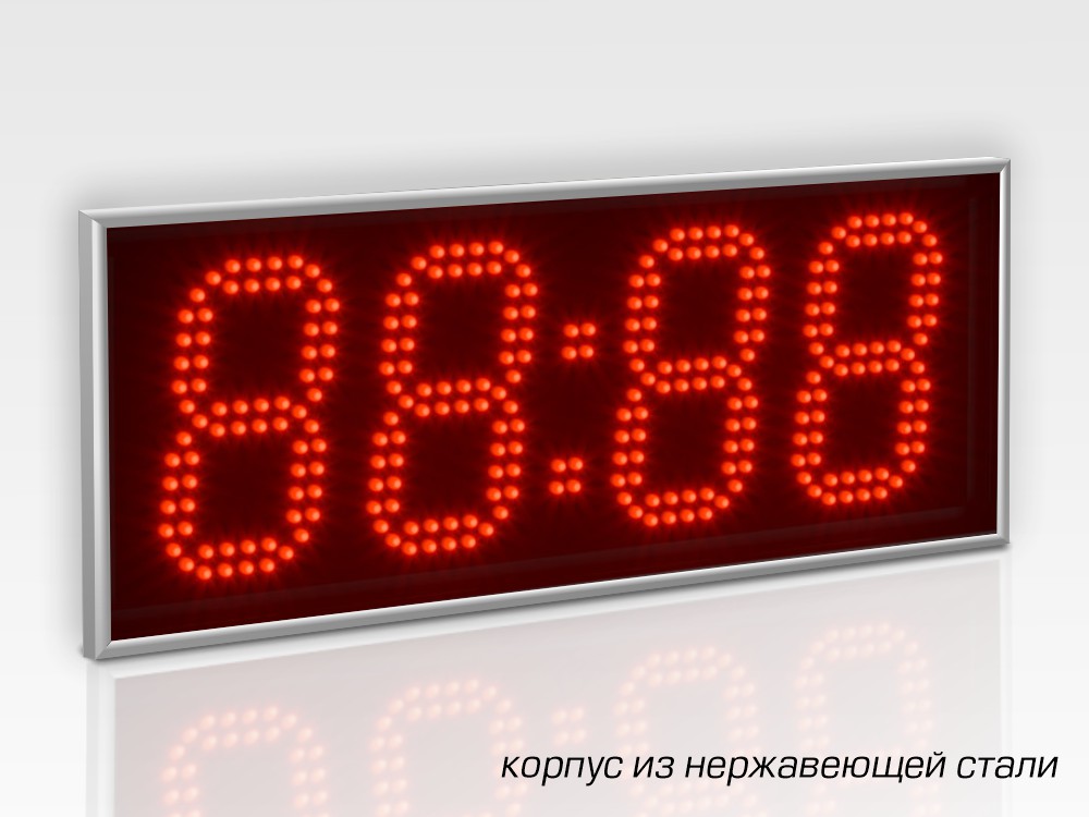Водонепроницаемый корпус из шлифованной нержавеющей стали, декоративный профиль из анодированного алюминия и акриловое стекло защищающее лицевую панель. Корпус устойчив к воздействию любых типов моющих/чистящих средств, ультрафиолета и агрессивных сред. Часы не выделяют тепла и загрязнений и не накапливают заряды электростатического электричества. Габаритные размеры 460x180 мм. Питание от сети переменного тока 220В/50Гц. Рабочий ресурс часов составляет 100 000 часов.