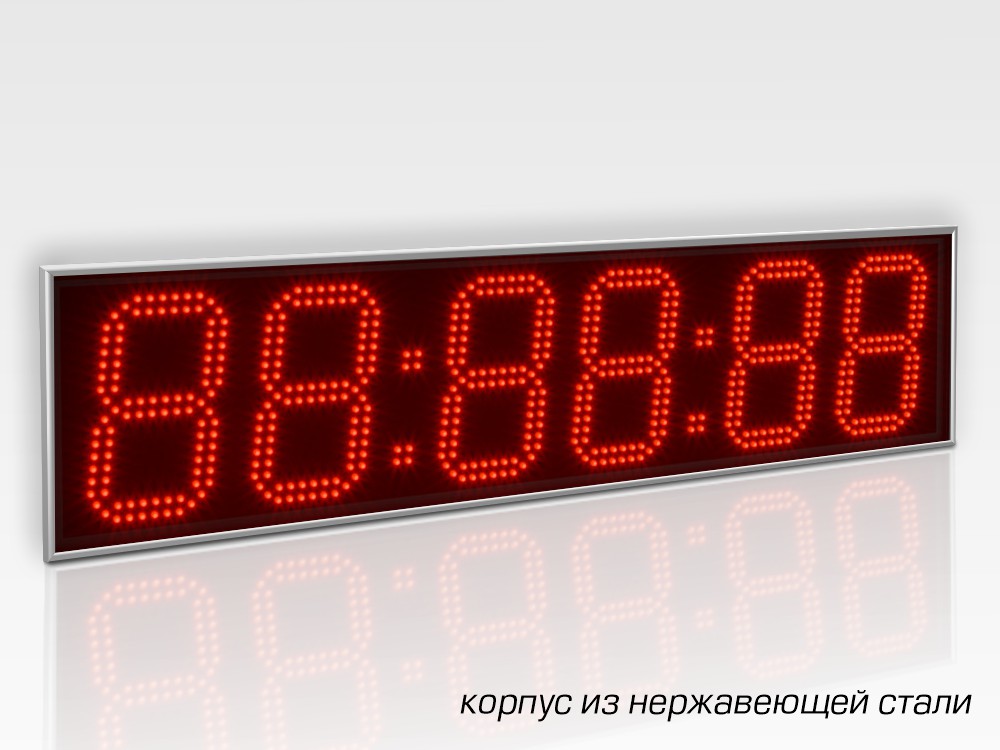 Водонепроницаемый корпус из шлифованной нержавеющей стали, декоративный профиль из анодированного алюминия и акриловое стекло защищающее лицевую панель. Корпус устойчив к воздействию любых типов моющих/чистящих средств, ультрафиолета и агрессивных сред. Часы не выделяют тепла и загрязнений и не накапливают заряды электростатического электричества. Габаритные размеры 770x200 мм. Питание от сети переменного тока 220В/50Гц. Рабочий ресурс часов составляет 100 000 часов.