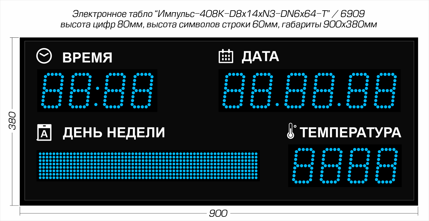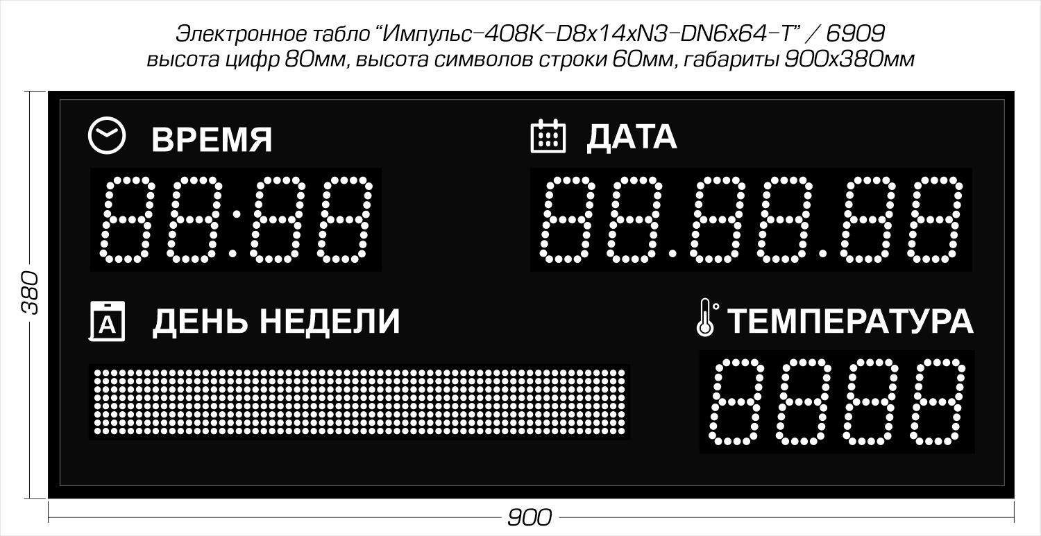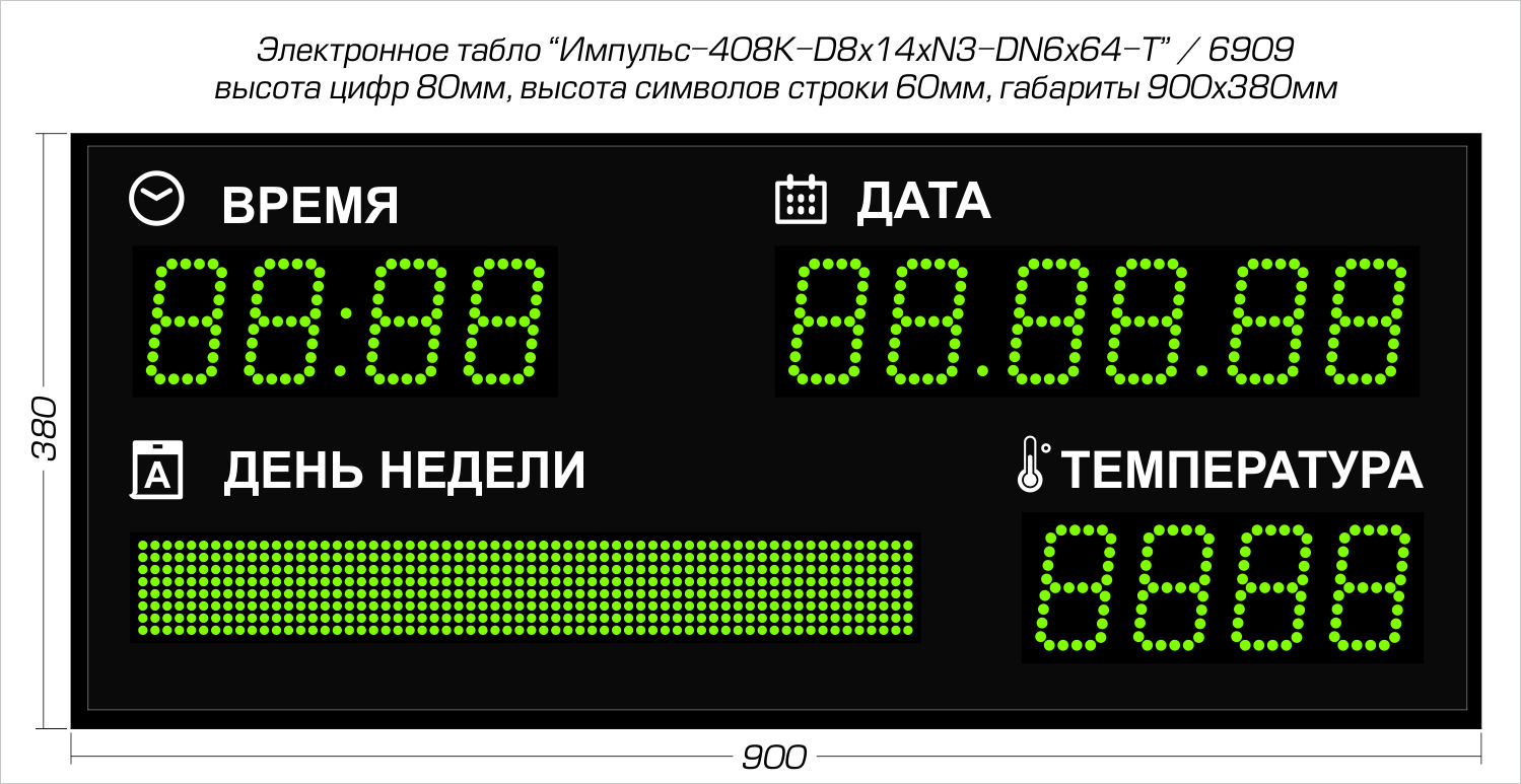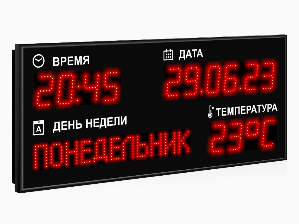 | Количество знаков, их высота | 13 разрядов по 80 мм (время, дата и температура) и поле высотой 60 мм (день недели) |