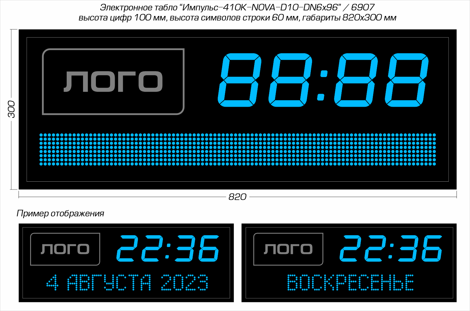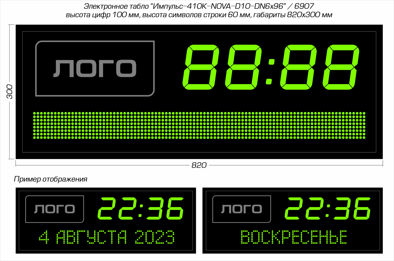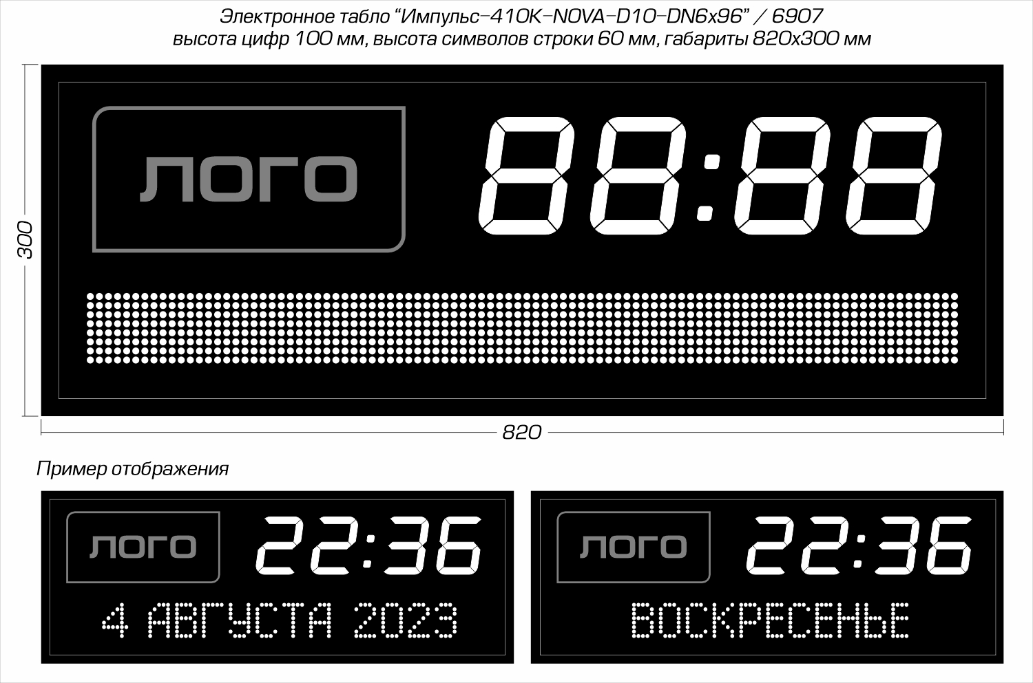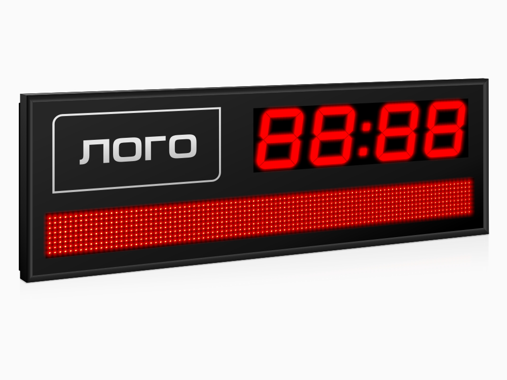 | Количество знаков, их высота | 4 разряда по 100 мм (время) и текстовое поле высотой 60 мм (дата и день недели, полностью) |