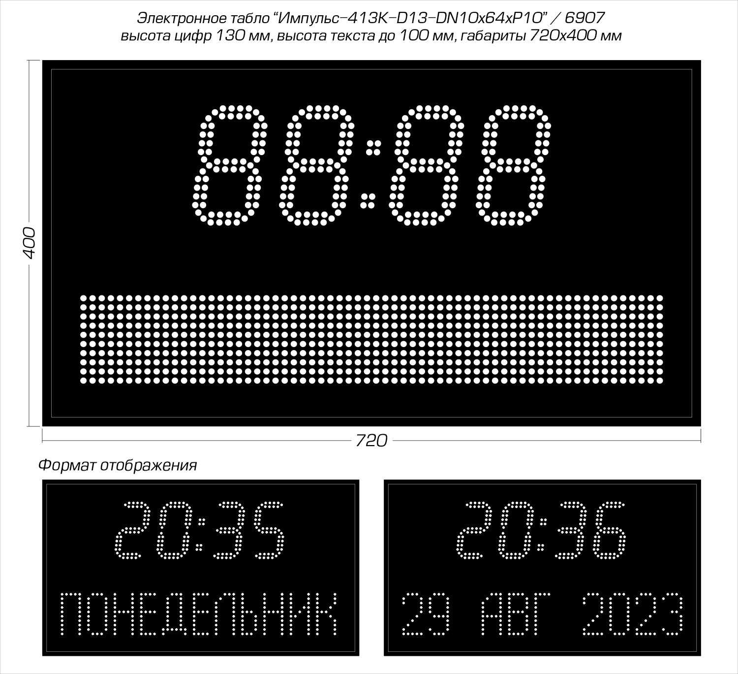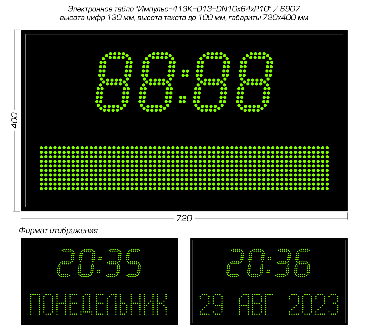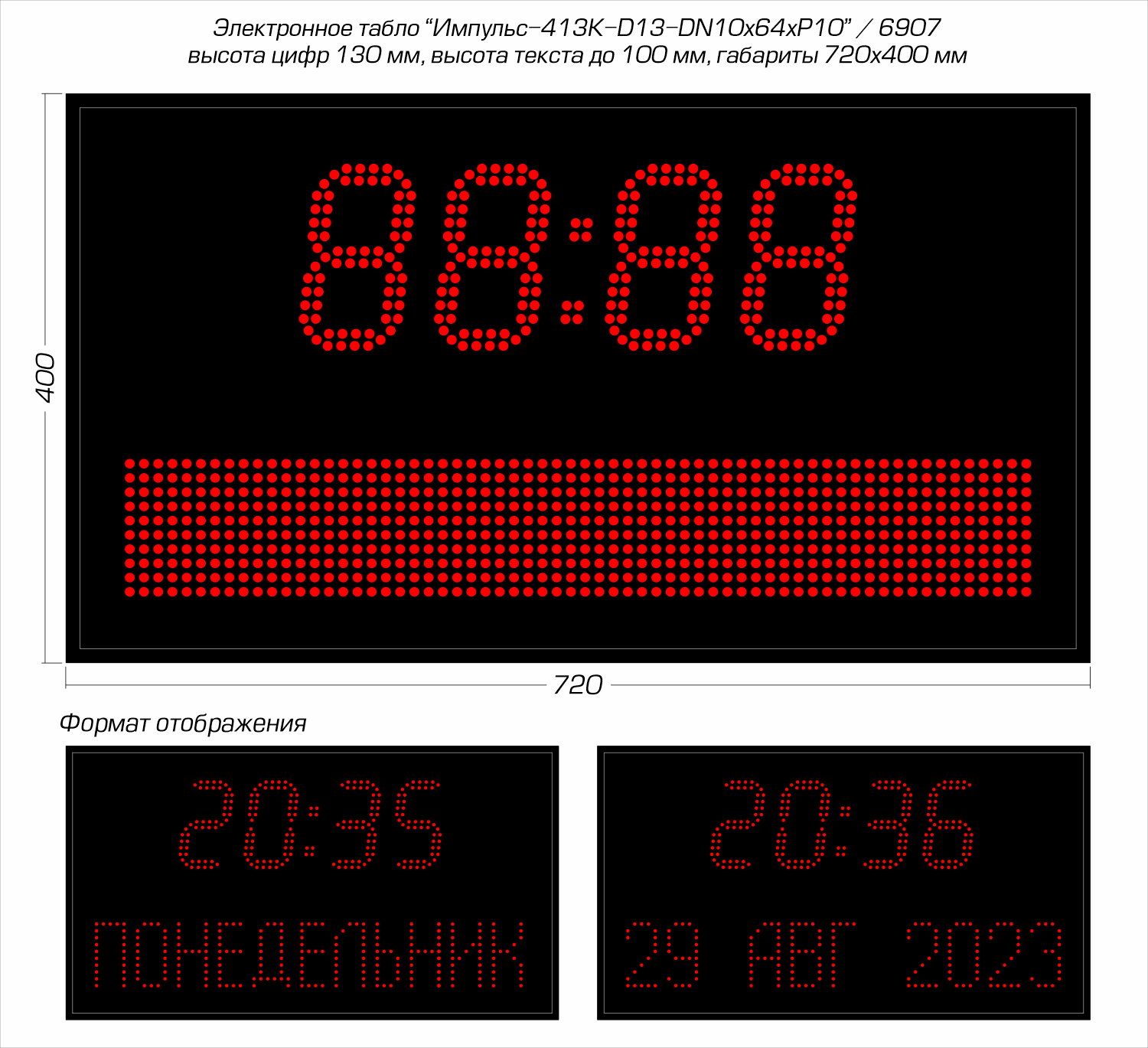 Электронные светодиодные часы-календарь Импульс-413K-D13-DN10x64xP10 производства компании РусИмпульс используются для постоянной демонстрации текущего времени (чч:мм) и попеременного показа даты (число, месяц и год) и дня недели. Рассчитаны на круглосуточный режим работы в сухих отапливаемых помещениях (IP-54) таких как: офис, ресепшен, столовая, проходная, приемная, коридор, кабинет сотрудника или руководителя и т.п. Если требуется эксплуатация устройства на открытом воздухе, то предусмотрен вариант уличного исполнения (IP-65, дополнительная опция!).