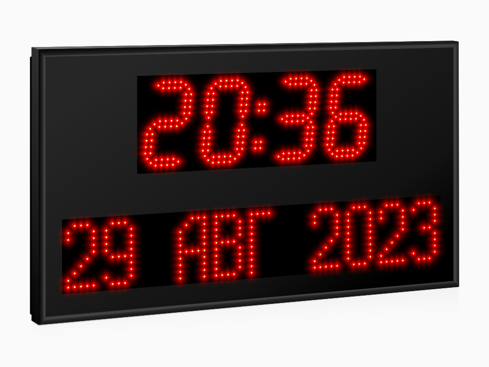 Дисплей часов создан на базе ярких точечных светодиодов, которые в данной модификации формируют четыре (4) цифровых разряда высотой 130 мм каждый для показа времени, а также текстовое поле из индикаторов (высота 100 мм) для отображения даты и дня недели. Дальность видимости до 50 метров, угол обзора в горизонтальной плоскости 120°, яркость 0,5 Кд (в уличном исполнении 3.0 Кд, дополнительная опция). Базовый цвет светодиодов - красный; опционально цвет можно заменить.