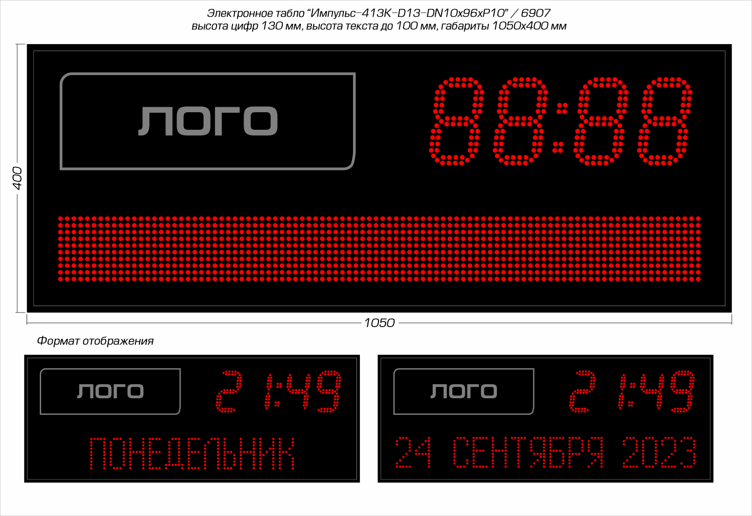 Электронные светодиодные часы-календарь Импульс-413K-D13-DN10x96xP10 производства компании РусИмпульс используются для постоянной демонстрации текущего времени (чч:мм) и попеременного показа даты (число, месяц и год) и дня недели. Особенностью модификации является наличие слева от индикаторов времени места для размещения логотипа компании, то есть, брендирования часов, что повышает положительный имидж и хорошо работает для PR. Часы рассчитаны на круглосуточный режим работы в сухих отапливаемых помещениях (IP-54) таких как: офисы, ресепшен, приемные и залы для переговоров, коридор, кабинет руководителя и т.п. Если требуется эксплуатация устройства на открытом воздухе, то предусмотрен вариант уличного исполнения (IP-65, дополнительная опция!).