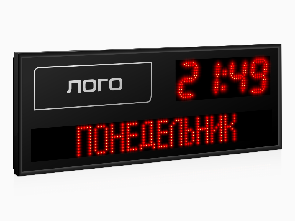 | Количество знаков, их высота | 4 разряда по 130 мм (время) и текстовое поле высотой 100 мм (дата и день недели, полностью) |