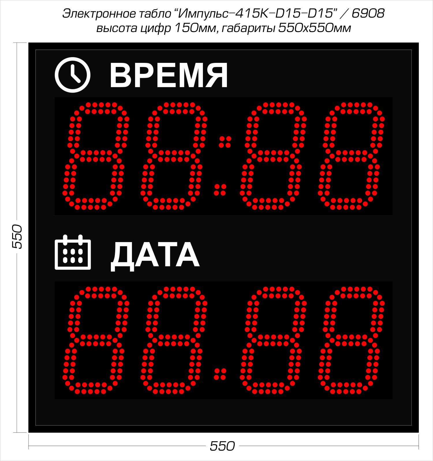 Электронные светодиодные часы-календарь Импульс-415K-D15-D15 производства компании РусИмпульс используются для одновременной демонстрации текущего времени (чч:мм) и даты (дд:мм). Рассчитаны на круглосуточный режим работы в сухих отапливаемых помещениях (IP-54) таких как: офис, ресепшен, столовая, проходная, приемная, коридор, кабинет сотрудника или руководителя и т.п. Если требуется эксплуатация устройства на открытом воздухе, то предусмотрен вариант уличного исполнения (IP-65, дополнительная опция!).