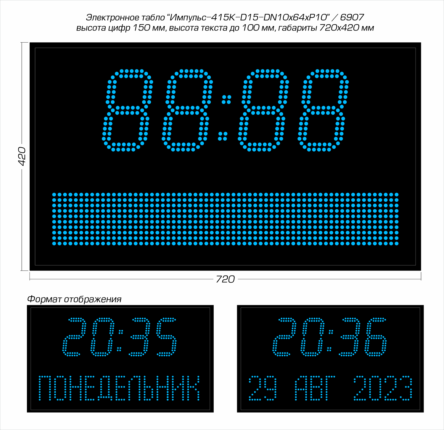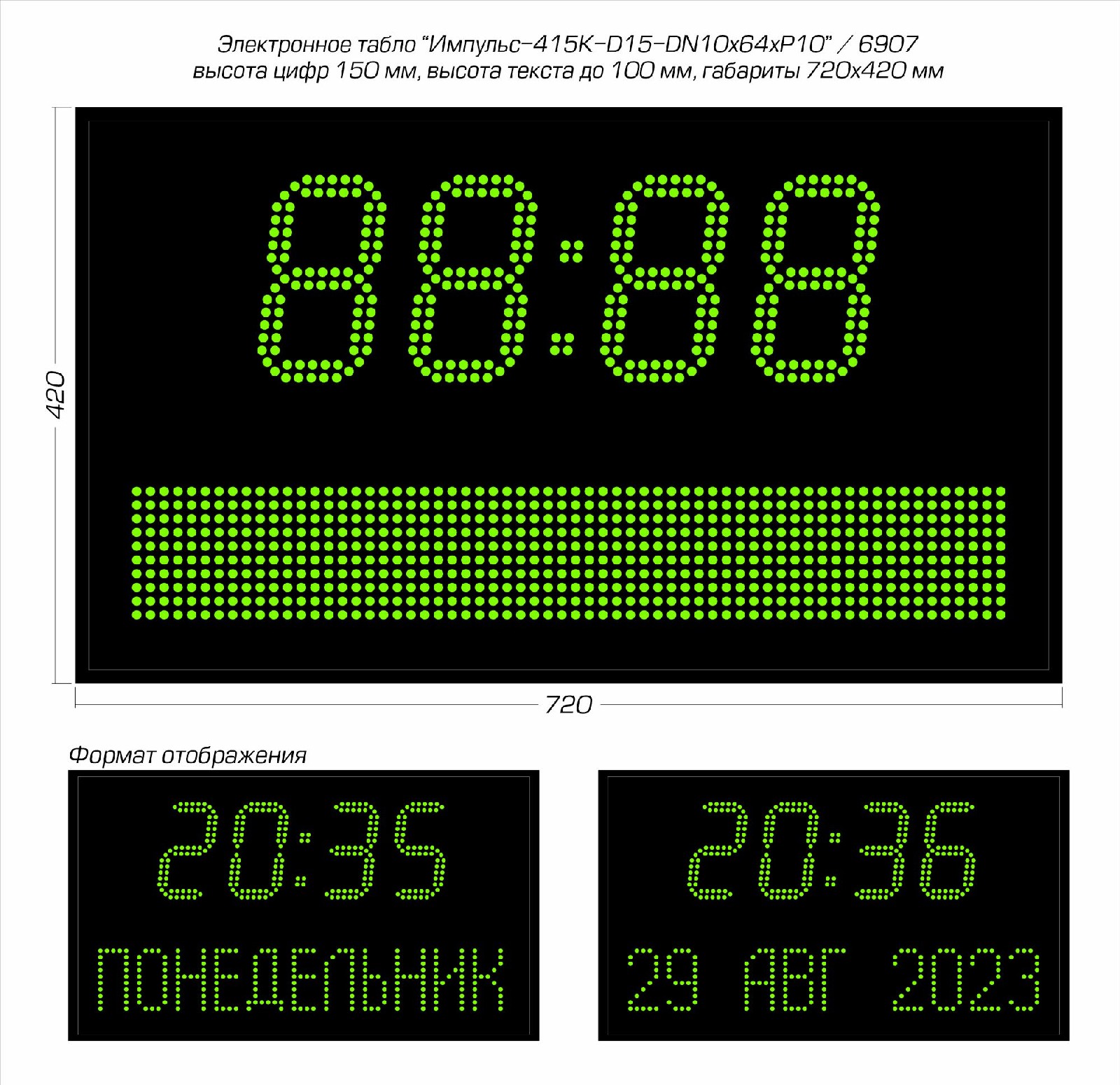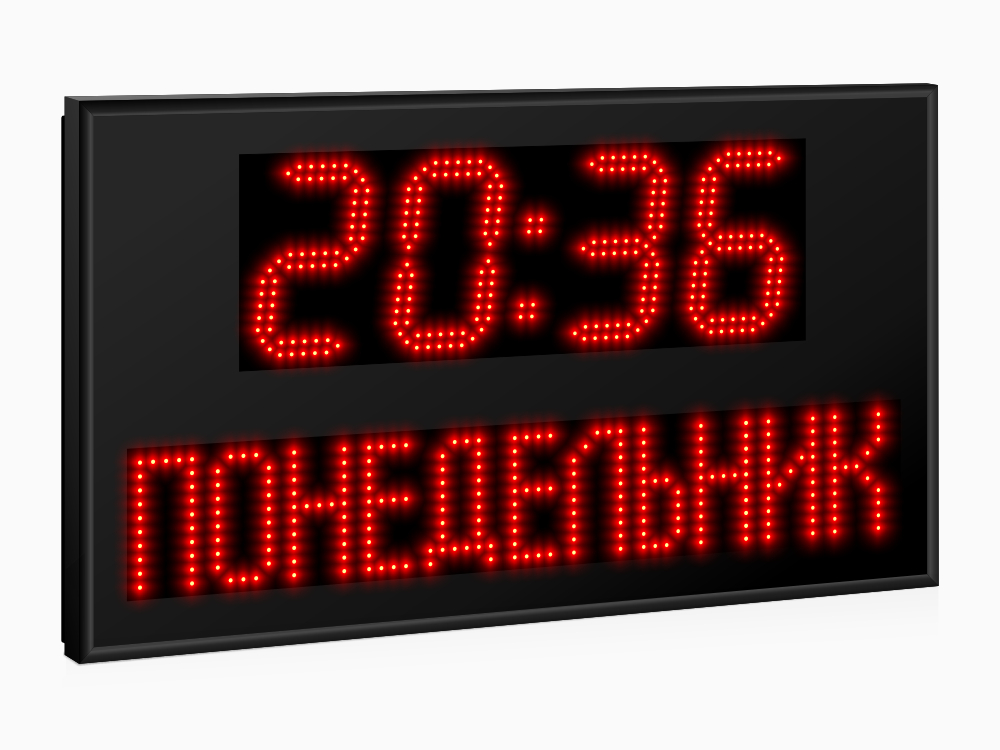 | Количество знаков, их высота | 4 разряда по 150 мм (время) и поле высотой 100 мм (дата и день недели) |