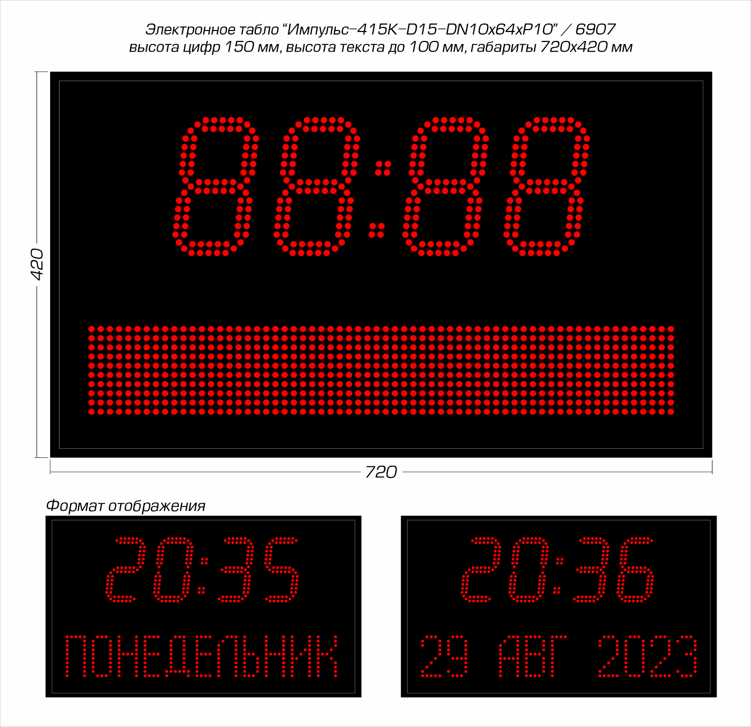Дисплей часов создан на базе ярких точечных светодиодов, которые в данной модификации формируют четыре (4) цифровых разряда высотой 150 мм каждый для показа времени, а также текстовое поле из индикаторов (высота 100 мм) для отображения даты и дня недели. Дальность видимости до 60 метров, угол обзора в горизонтальной плоскости 120°, яркость 0,5 Кд (в уличном исполнении 3.0 Кд, дополнительная опция). Базовый цвет светодиодов - красный; опционально цвет можно заменить.