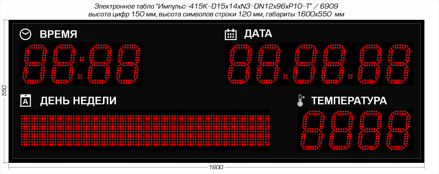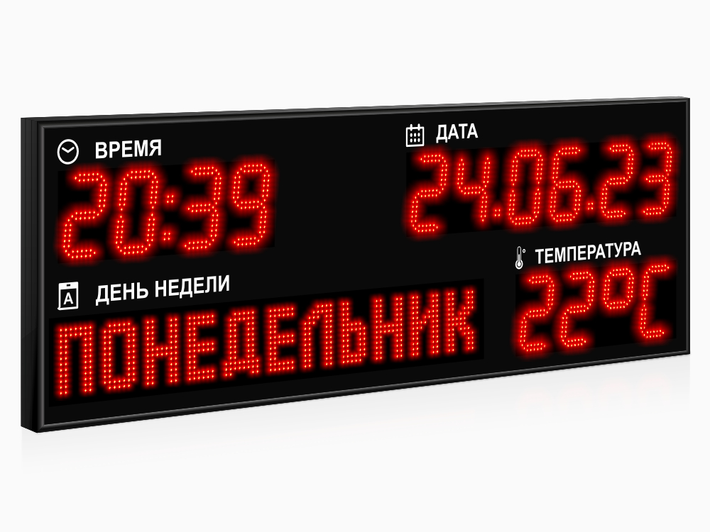 | Количество знаков, их высота | 13 разрядов по 150 мм (время, дата и температура) и поле высотой 120 мм (день недели) |