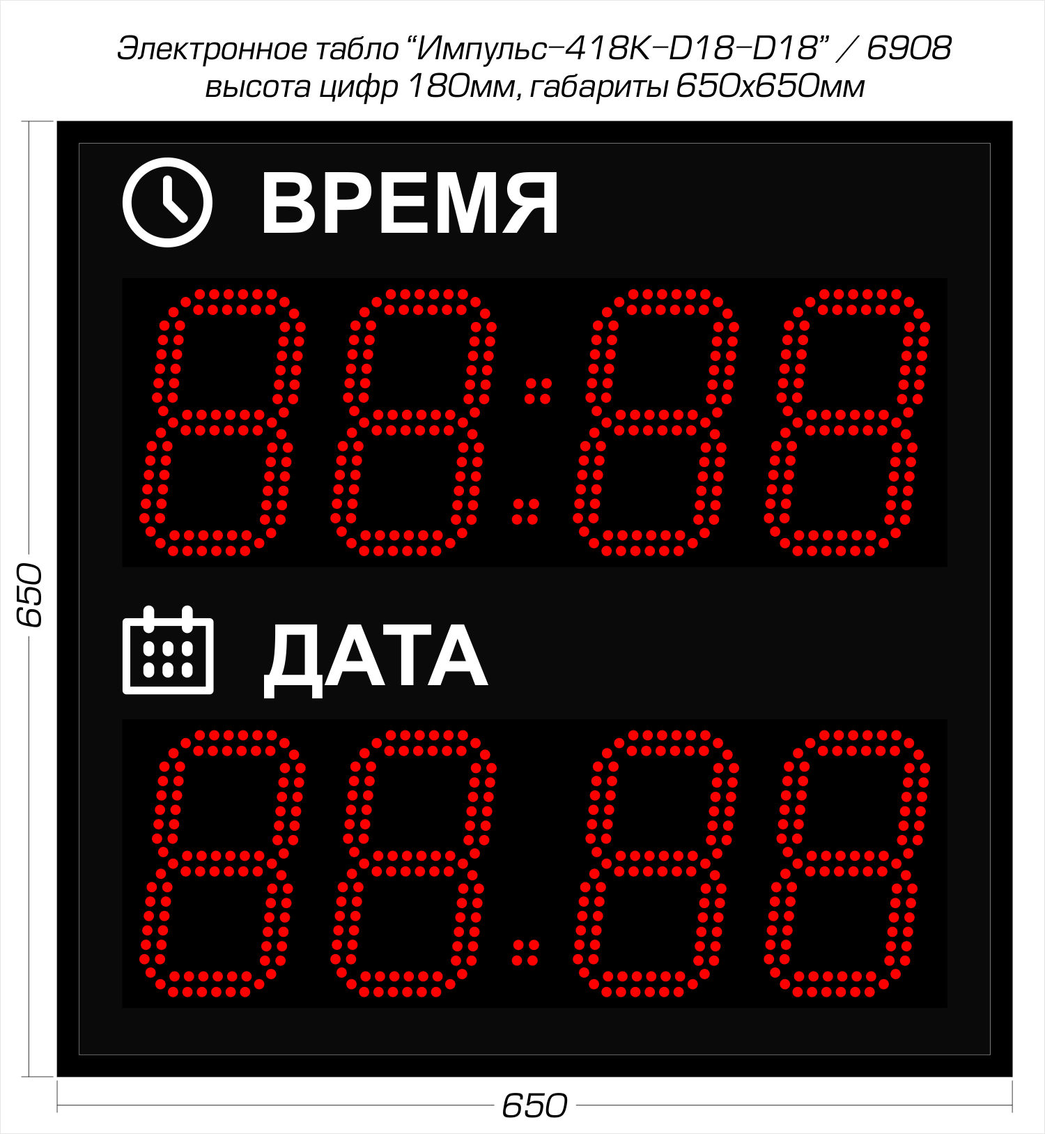 Электронные светодиодные часы-календарь Импульс-418K-D18-D18 производства компании РусИмпульс используются для одновременной демонстрации текущего времени (чч:мм) и даты (дд:мм). Рассчитаны на круглосуточный режим работы в сухих отапливаемых помещениях (IP-54) таких как: офис, ресепшен, столовая, проходная, приемная, коридор, кабинет сотрудника или руководителя и т.п. Если требуется эксплуатация устройства на открытом воздухе, то предусмотрен вариант уличного исполнения (IP-65, дополнительная опция!).