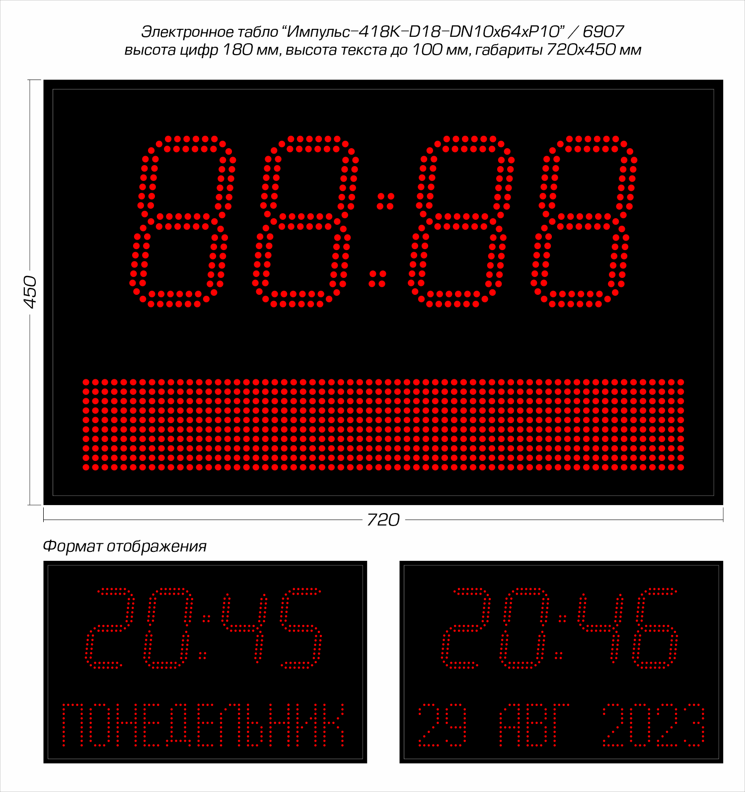 Электронные светодиодные часы-календарь Импульс-418K-D18-DN10x64xP10 производства компании РусИмпульс используются для постоянной демонстрации текущего времени (чч:мм) и попеременного показа даты (число, месяц и год) и дня недели. Рассчитаны на круглосуточный режим работы в сухих отапливаемых помещениях (IP-54) таких как: офис, ресепшен, столовая, проходная, приемная, коридор, кабинет сотрудника или руководителя и т.п. Если требуется эксплуатация устройства на открытом воздухе, то предусмотрен вариант уличного исполнения (IP-65, дополнительная опция!).