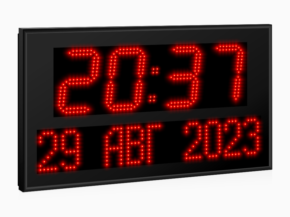 Дисплей часов создан на базе ярких точечных светодиодов, которые в данной модификации формируют четыре (4) цифровых разряда высотой 180 мм каждый для показа времени, а также текстовое поле из индикаторов (высота 100 мм) для отображения даты и дня недели. Дальность видимости до 65 метров, угол обзора в горизонтальной плоскости 120°, яркость 0,5 Кд (в уличном исполнении 3.0 Кд, дополнительная опция). Базовый цвет светодиодов - красный; опционально цвет можно заменить.
