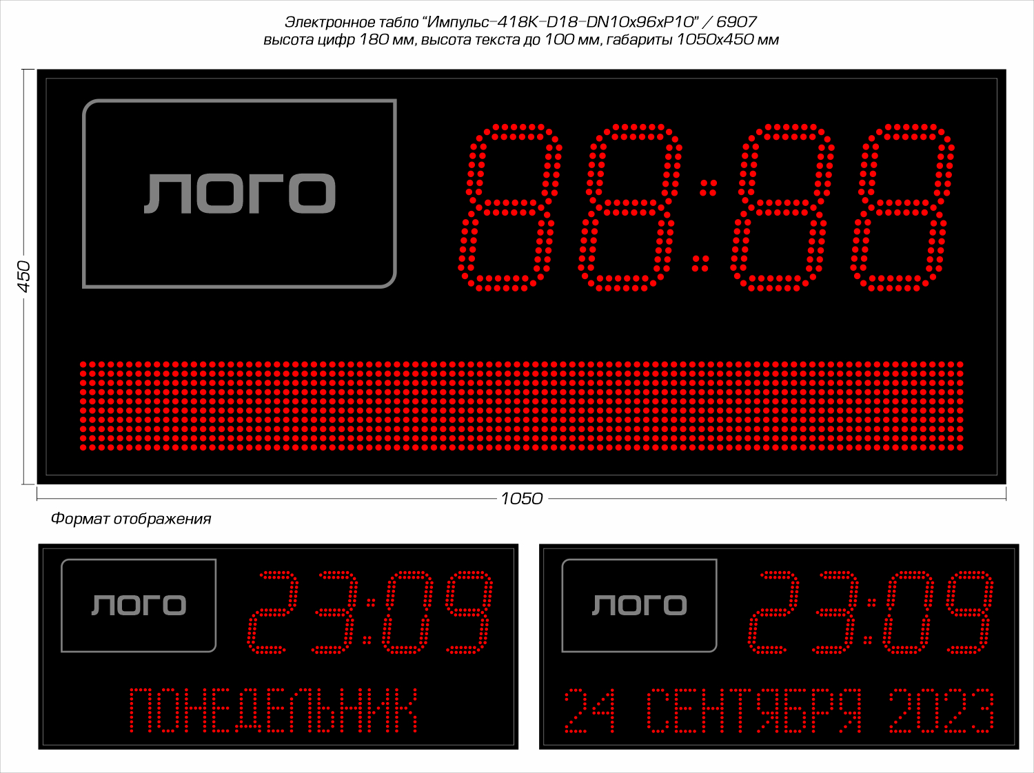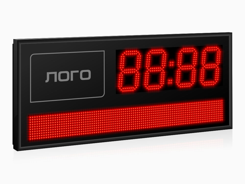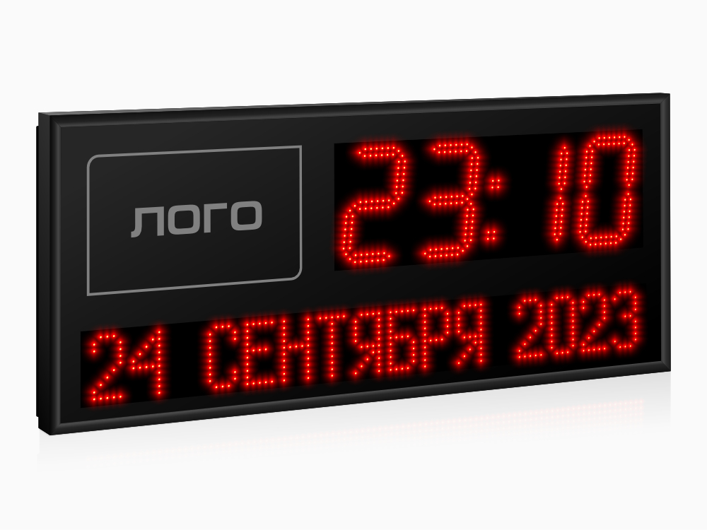 | Количество знаков, их высота | 4 разряда по 180 мм (время) и текстовое поле высотой 100 мм (дата и день недели, полностью) |