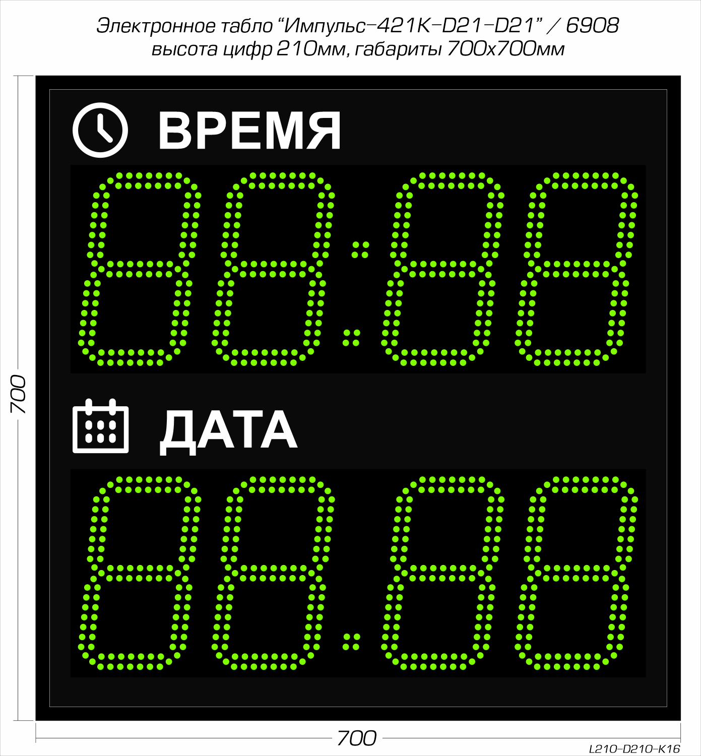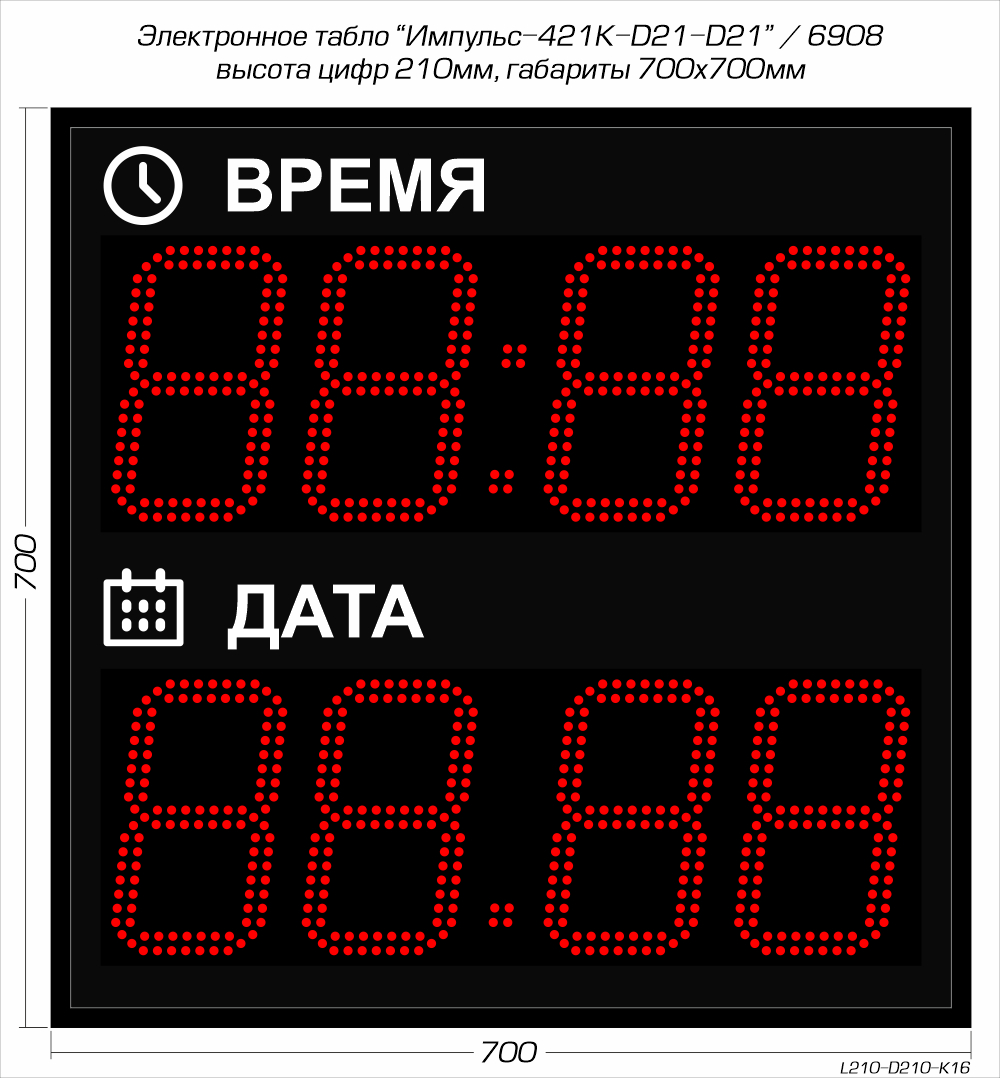 Электронные светодиодные часы-календарь Импульс-421K-D21-D21 производства компании РусИмпульс используются для одновременной демонстрации текущего времени (чч:мм) и даты (дд:мм). Рассчитаны на круглосуточный режим работы в сухих отапливаемых помещениях (IP-54) таких как: офис, ресепшен, столовая, проходная, приемная, коридор, кабинет сотрудника или руководителя и т.п. Если требуется эксплуатация устройства на открытом воздухе, то предусмотрен вариант уличного исполнения (IP-65, дополнительная опция!).