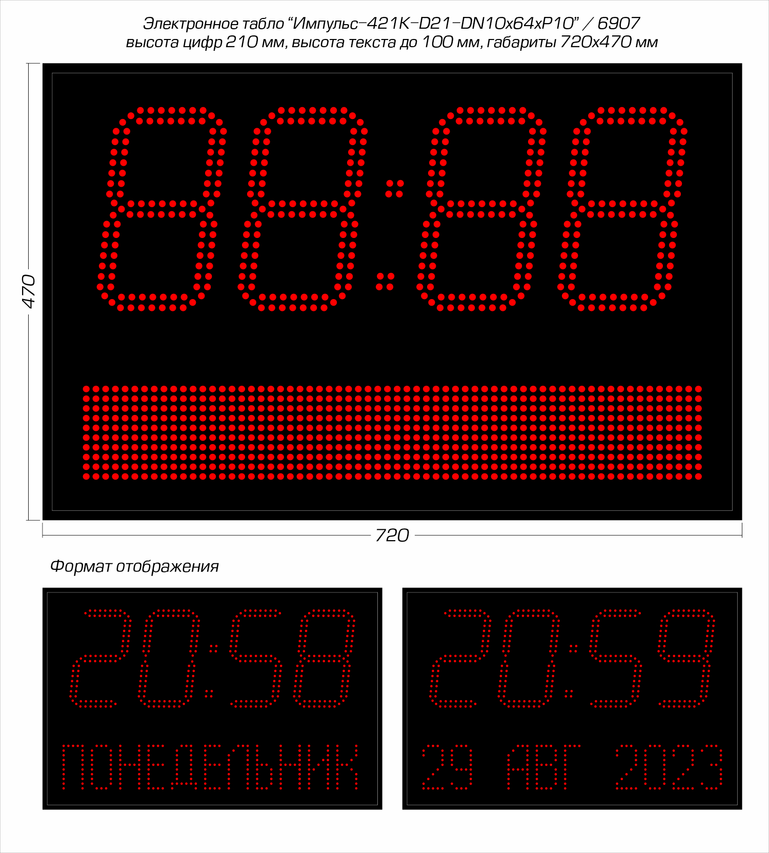 Электронные светодиодные часы-календарь Импульс-421K-D21-DN10x64xP10 производства компании РусИмпульс используются для постоянной демонстрации текущего времени (чч:мм) и попеременного показа даты (число, месяц и год) и дня недели. Рассчитаны на круглосуточный режим работы в сухих отапливаемых помещениях (IP-54) таких как: офис, ресепшен, столовая, проходная, приемная, коридор, кабинет сотрудника или руководителя и т.п. Если требуется эксплуатация устройства на открытом воздухе, то предусмотрен вариант уличного исполнения (IP-65, дополнительная опция!).