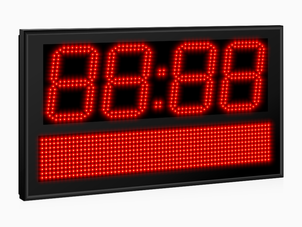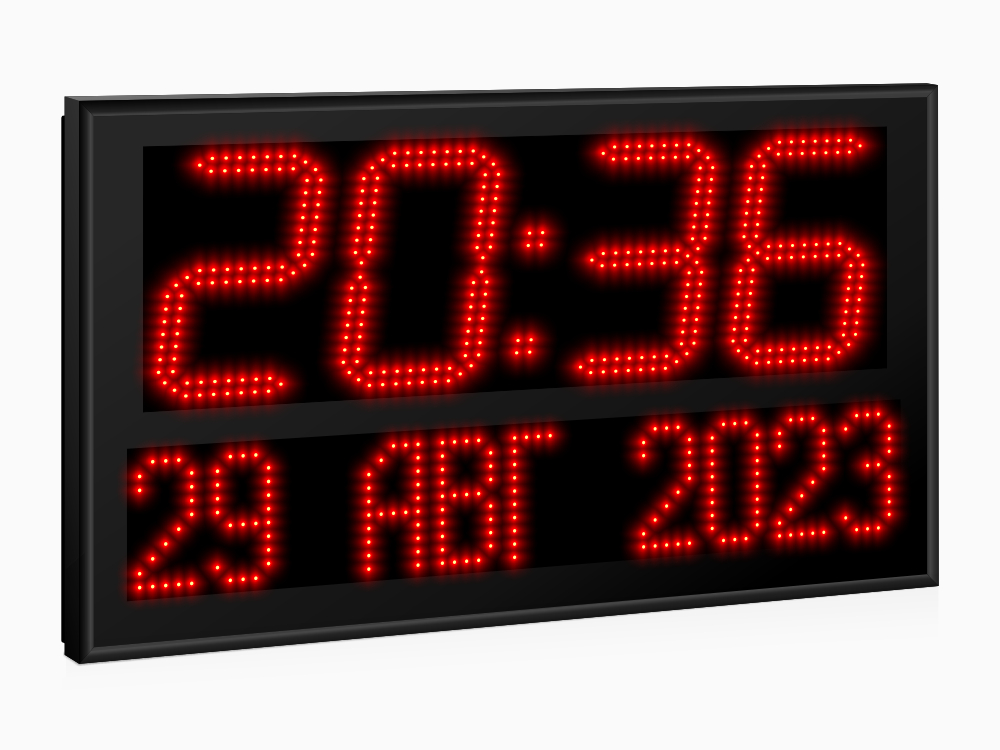 Дисплей часов создан на базе ярких точечных светодиодов, которые в данной модификации формируют четыре (4) цифровых разряда высотой 210 мм каждый для показа времени, а также текстовое поле из индикаторов (высота 100 мм) для отображения даты и дня недели. Дальность видимости до 75 метров, угол обзора в горизонтальной плоскости 120°, яркость 0,5 Кд (в уличном исполнении 3.0 Кд, дополнительная опция). Базовый цвет светодиодов - красный; опционально цвет можно заменить.