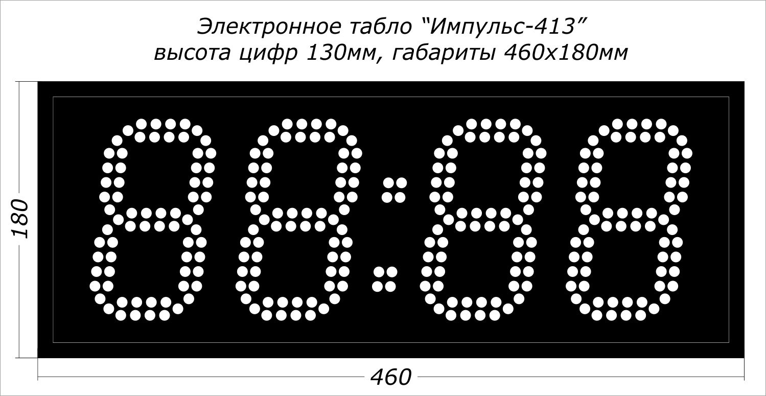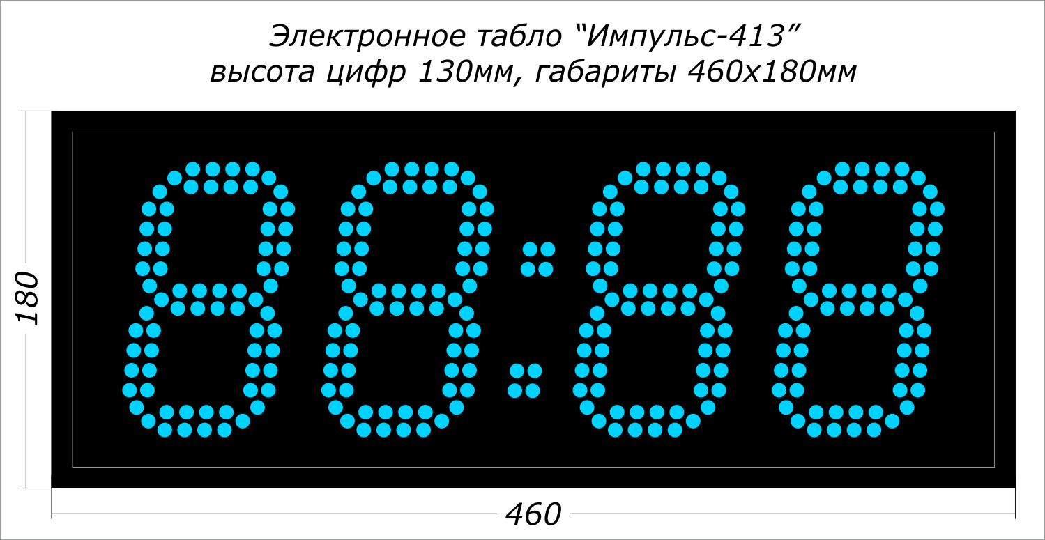 Офисные светодиодные часы Импульс-413 производства компании РусИмпульс используются для попеременной демонстрации текущего времени (чч:мм) и даты (дд:мм). Рассчитаны на круглосуточный режим работы в сухих отапливаемых помещениях (IP-54) таких как: офис, ресепшен, столовая, проходная, приемная, коридор, кабинет сотрудника или руководителя и т.п. Автономное устройство, которое можно включить в состав системы часофикации как ведомые часы за счёт дополнительных модулей (см. ниже). Все пользовательские настройки производятся инфракрасным пультом ДУ с расстояния до 10 метров.