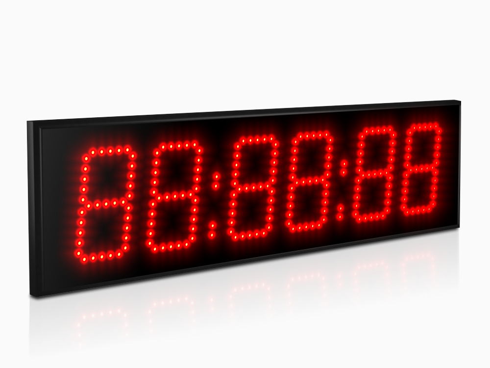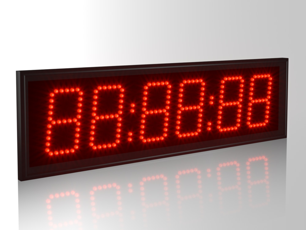 Дисплей создан из точечных светодиодов, в данной модификации они формируют шесть (6) разрядов высотой 100 мм. Дальность видимости до 40 метров, угол обзора в горизонтальной плоскости 120°, очень высокая яркость 3.0 Кд позволяет считывать показатели часов даже в условиях засветки солнечным светом. Базовый цвет светодиодов - красный; опционально цвет можно заменить (см. ниже).