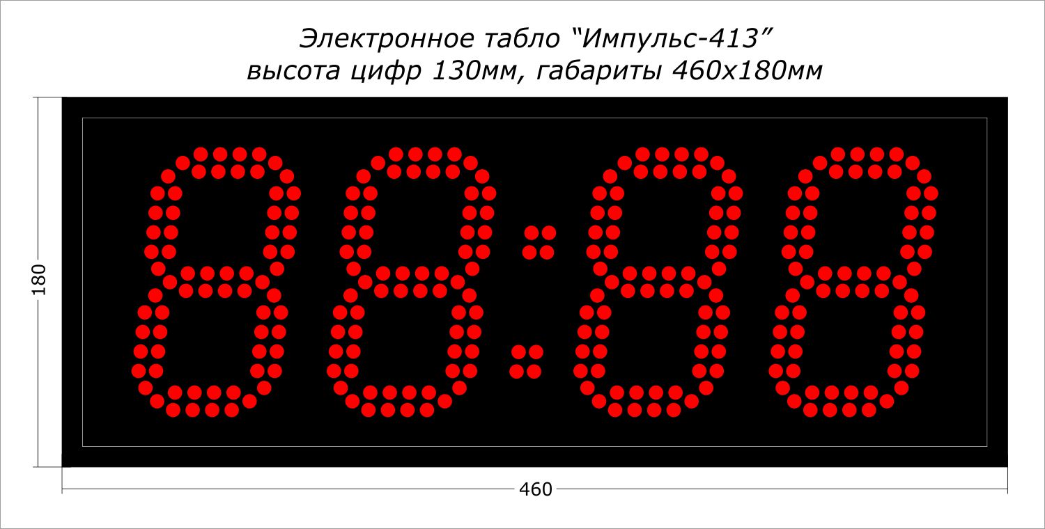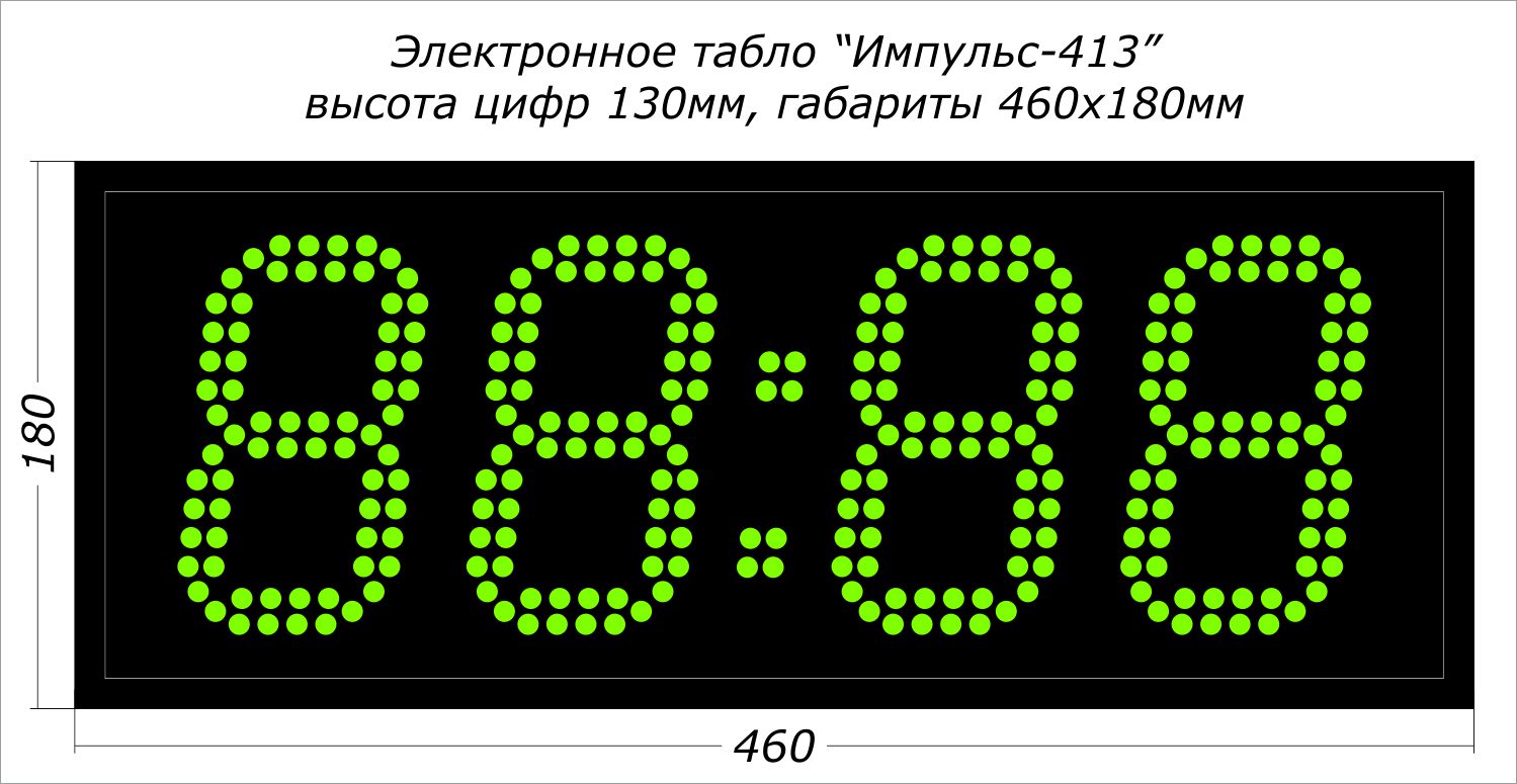 Всепогодные светодиодные часы Импульс-413-T производства компании РусИмпульс используются для попеременной демонстрации текущего времени (чч:мм), даты (дд:мм) и температуры окружающего воздуха (выносной датчик, длина провода 1,5 м). Рассчитаны на круглосуточный режим работы в уличных условиях (IP-65) и размещаются на стенах различных зданий. Автономное устройство, которое можно включить в состав системы часофикации как ведомые часы за счёт дополнительных модулей (см. ниже). Пользовательские настройки (время и длительность отображения каждого параметра) производятся инфракрасным пультом ДУ с расстояния до 10 метров.