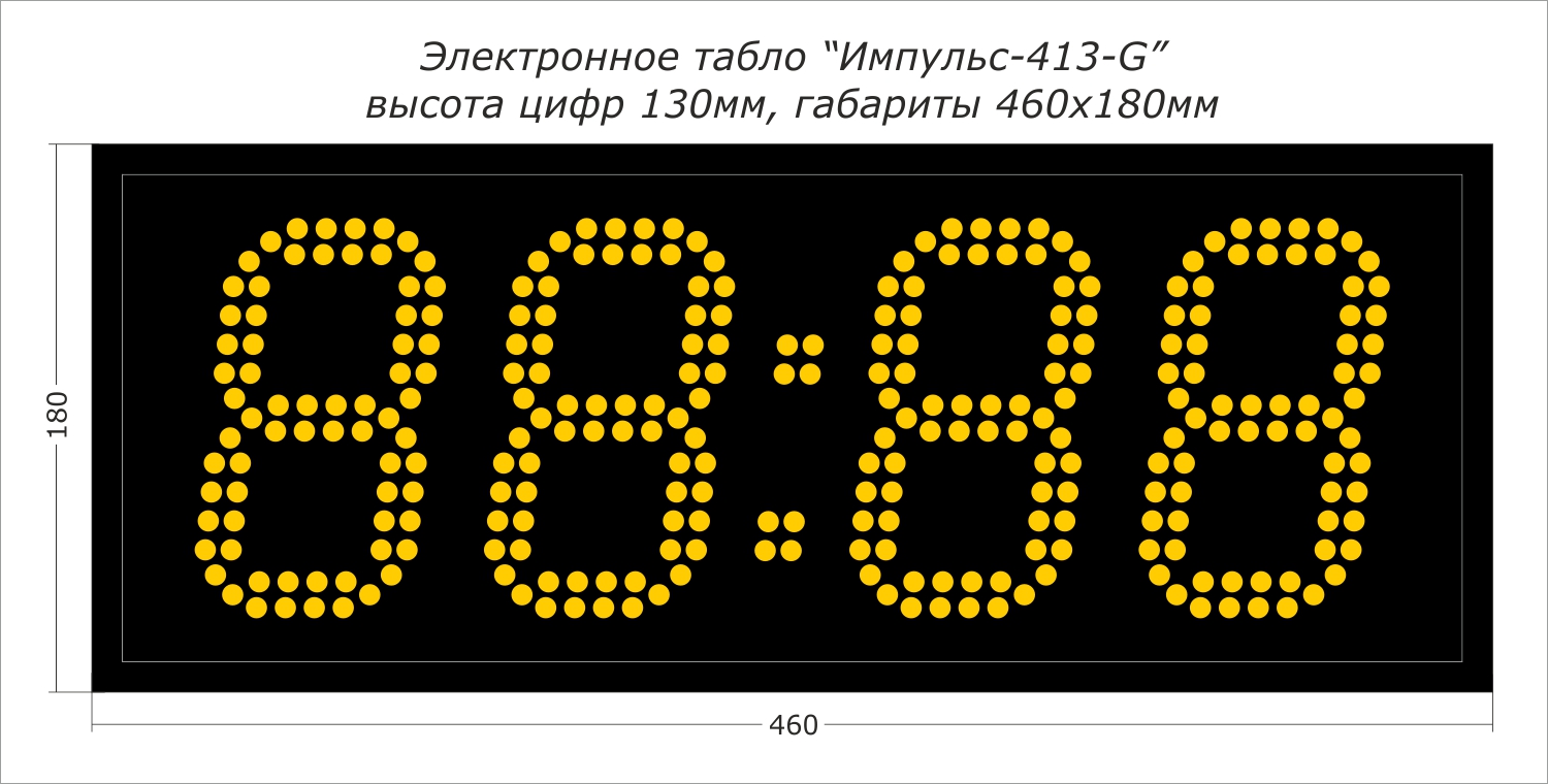 Дисплей создан из точечных светодиодов, в данной модификации они формируют четыре (4) разряда каждый высотой 130 мм. Дальность видимости до 50 метров, угол обзора в горизонтальной плоскости 120°, очень высокая яркость 3.0 Кд позволяет считывать показатели часов даже в условиях засветки солнечным светом. Базовый цвет светодиодов - красный; опционально цвет можно заменить (см. ниже).