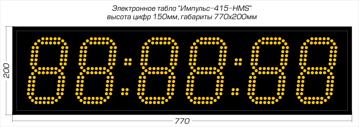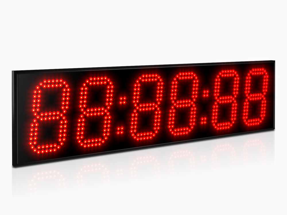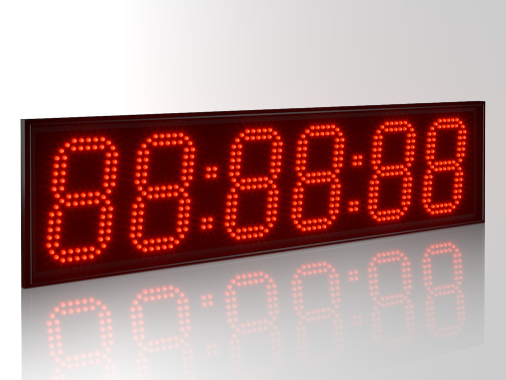 Дисплей создан из точечных светодиодов, в данной модификации они формируют шесть (6) разрядов высотой 150 мм. Дальность видимости до 65 метров, угол обзора в горизонтальной плоскости 120°, очень высокая яркость 3.0 Кд позволяет считывать показатели часов даже в условиях засветки солнечным светом. Базовый цвет светодиодов - красный; опционально цвет можно заменить (см. ниже).