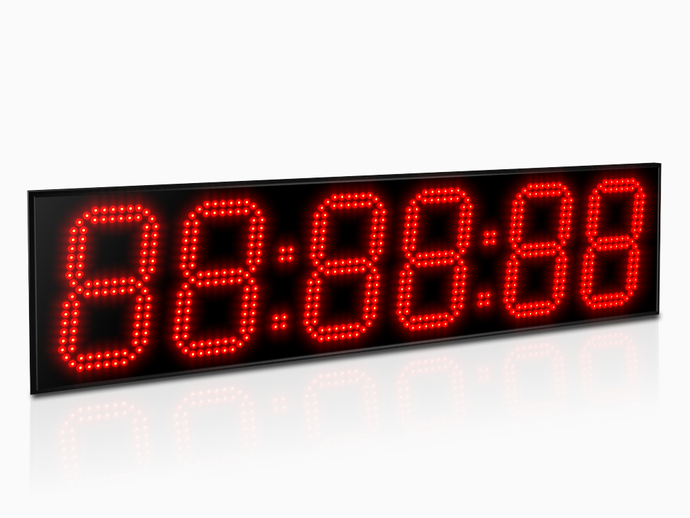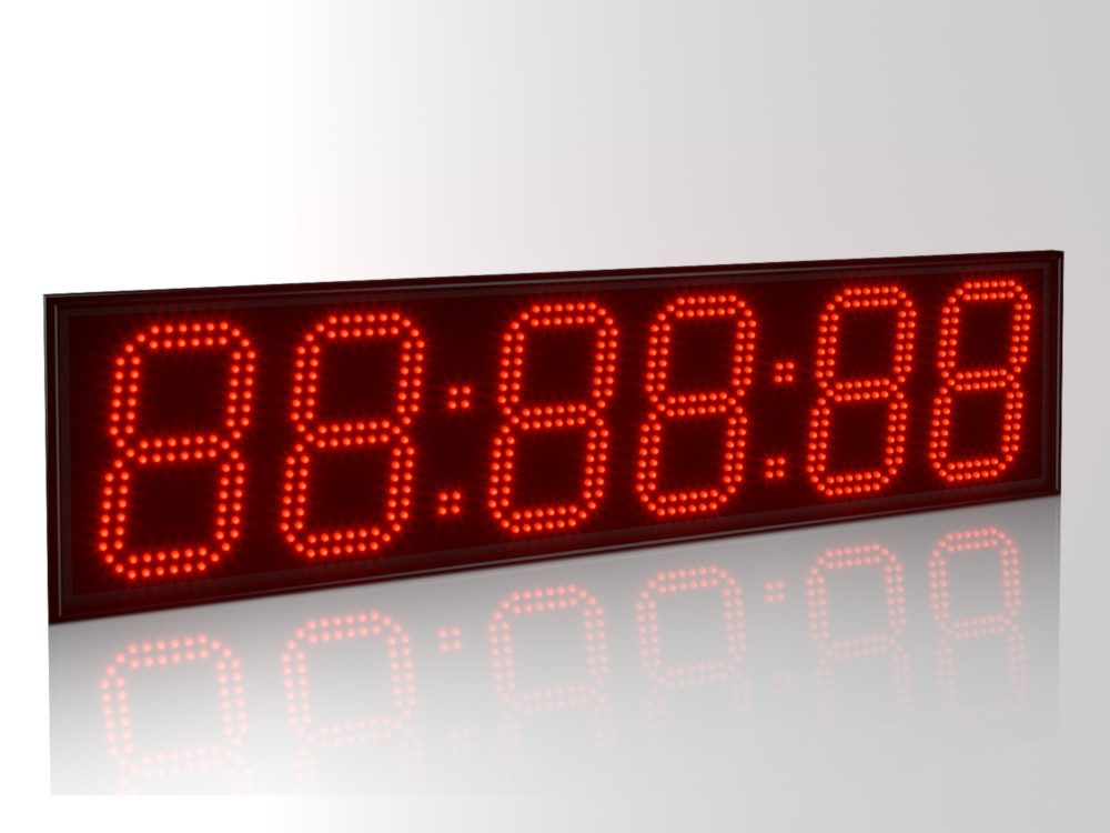 Дисплей создан из точечных светодиодов, в данной модификации они формируют шесть (6) разрядов высотой 180 мм. Дальность видимости до 75 метров, угол обзора в горизонтальной плоскости 120°, очень высокая яркость 3.0 Кд позволяет считывать показатели часов даже в условиях засветки солнечным светом. Базовый цвет светодиодов - красный; опционально цвет можно заменить (см. ниже).