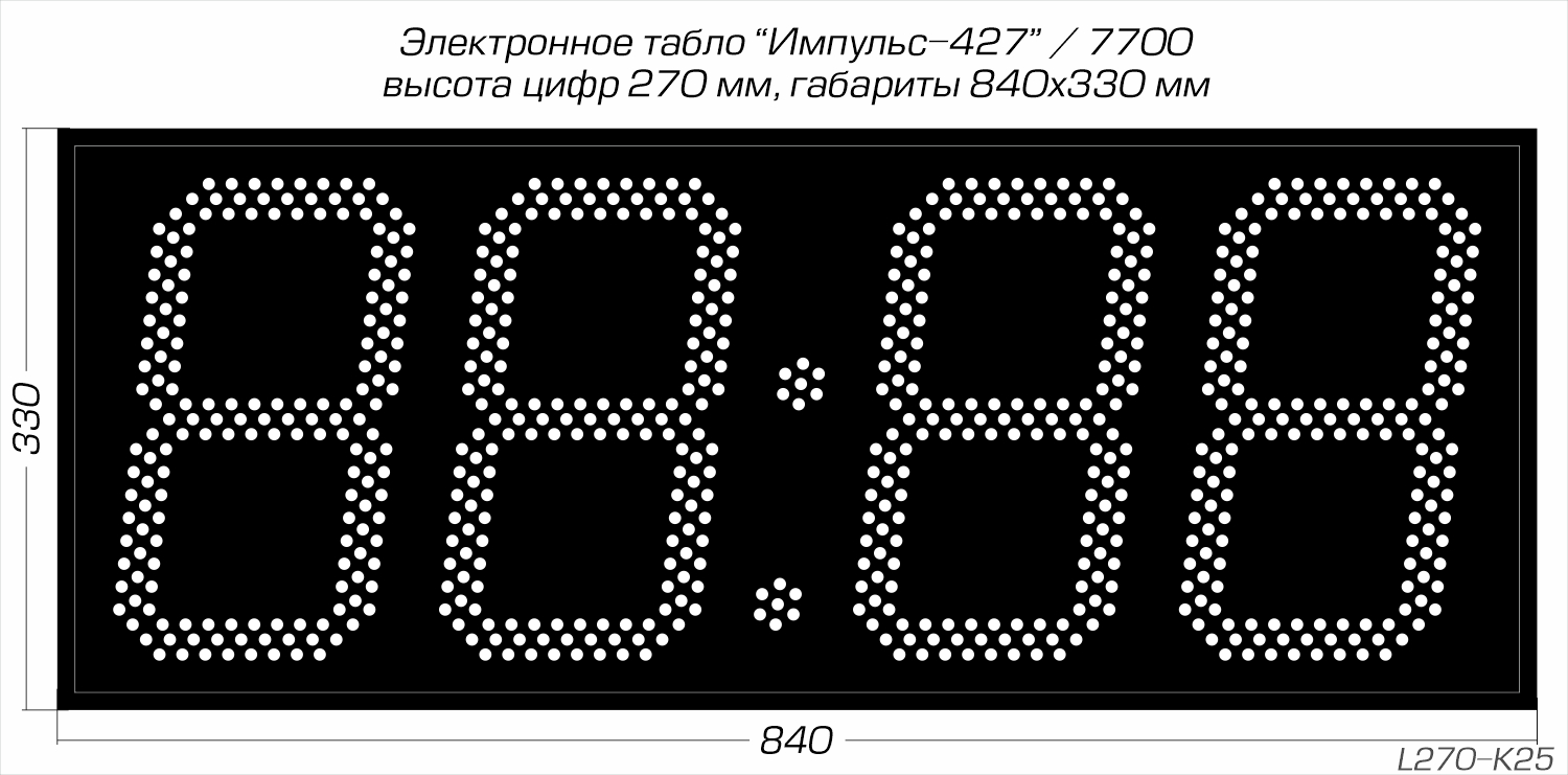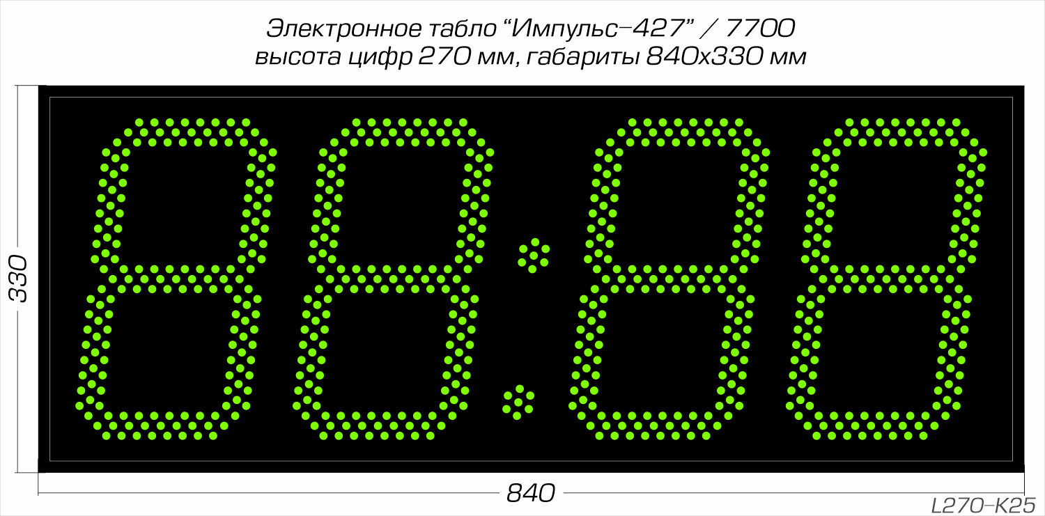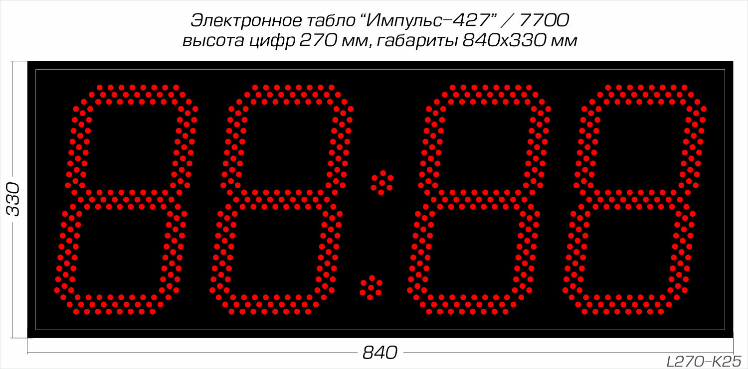 Дисплей создан из точечных светодиодов, в данной модификации они формируют четыре (4) разряда каждый высотой 270 мм. Дальность видимости до 110 метров, угол обзора в горизонтальной плоскости 120°, очень высокая яркость 3.0 Кд позволяет считывать показатели часов даже в условиях засветки солнечным светом. Базовый цвет светодиодов - красный; опционально цвет можно заменить (см. ниже).