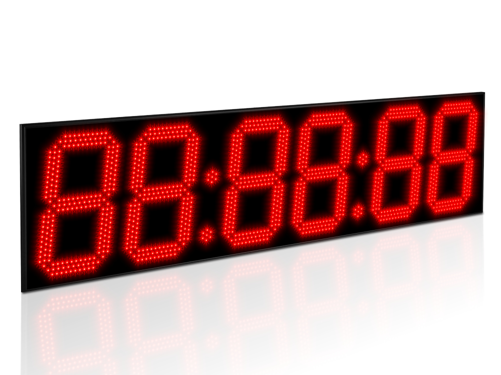 Дисплей создан из точечных светодиодов, в данной модификации они формируют шесть (6) разрядов высотой 350 мм. Дальность видимости до 140 метров, угол обзора в горизонтальной плоскости 120°, очень высокая яркость 3.0 Кд позволяет считывать показатели часов даже в условиях засветки солнечным светом. Базовый цвет светодиодов - красный; опционально цвет можно заменить (см. ниже).