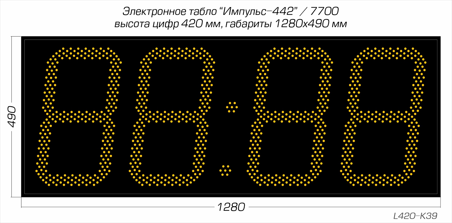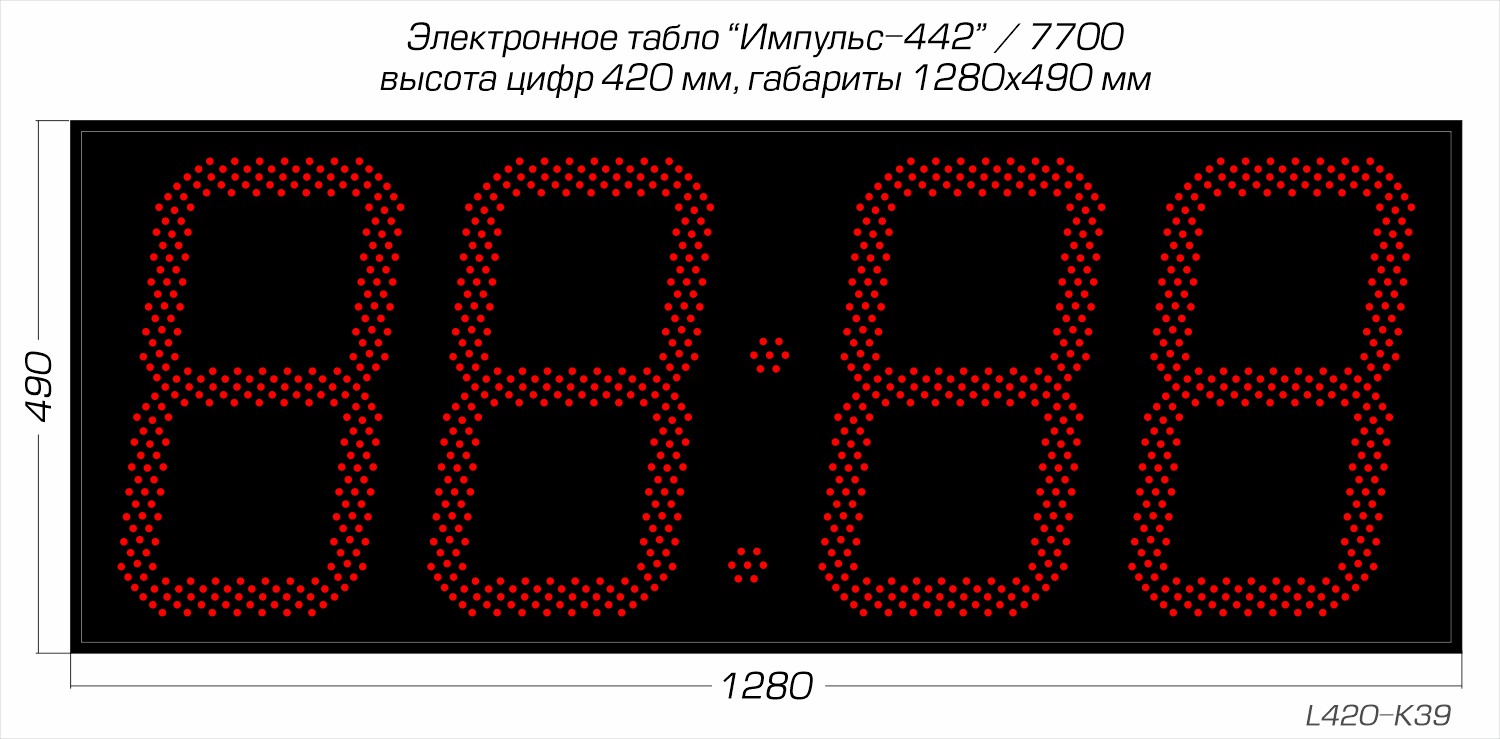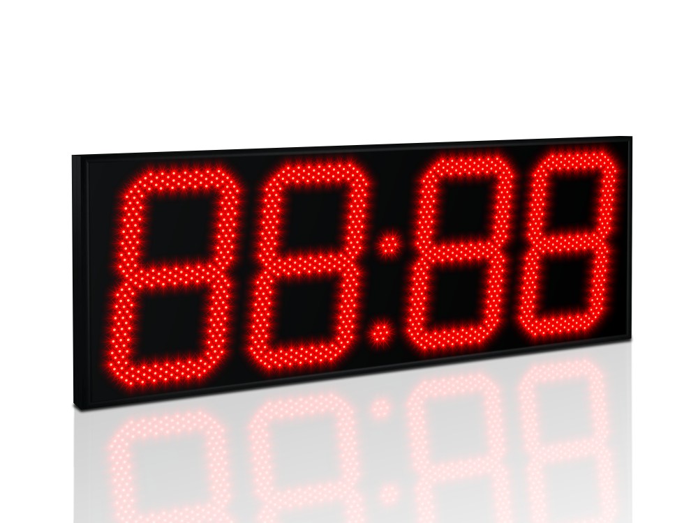 Дисплей создан из точечных светодиодов, в данной модификации они формируют четыре (4) разряда каждый высотой 420 мм. Дальность видимости до 160 метров, угол обзора в горизонтальной плоскости 120°, очень высокая яркость 3.0 Кд позволяет считывать показатели часов даже в условиях засветки солнечным светом. Базовый цвет светодиодов - красный; опционально цвет можно заменить (см. ниже).