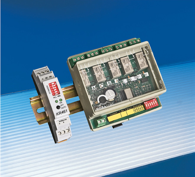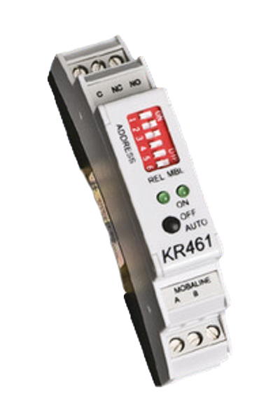 MOBATIME KR461 - это адресное реле, предназначенное для построения систем единого времени. Управление осуществляется по линии MOBALine от первичных мастер-часов. Реле имеет один выход и поддерживает как ручной, так и автоматический режимы управления. На передней панели расположены светодиодные индикаторы и тумблеры для присвоения адреса. Всего в линии может быть использовано до 64 таких релейных блоков. Питание блока осуществляется также по линии MOBALine. Установка производится на монтажную DIN рейку.