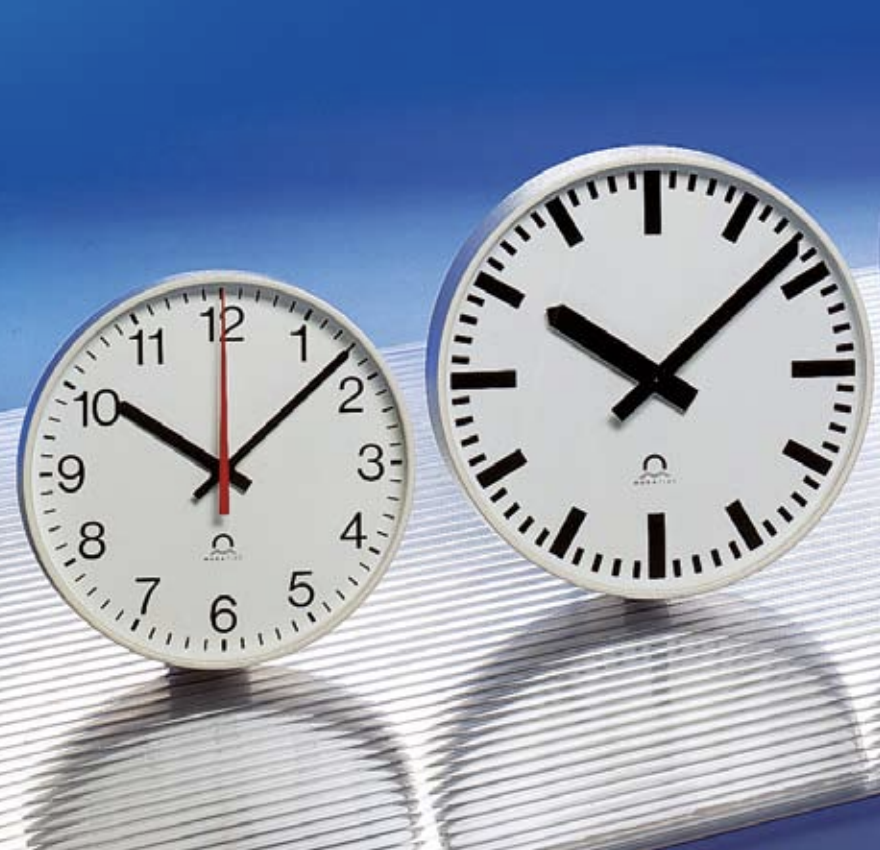 Аналоговые; для внутренних инсталляций; синхронизация по системе MOBALine; аналоговый циферблат с черными метками; стрелки - часы и минуты; питание 10-20 В / 50 Гц; корпус металл; плоское защитное стекло; диаметр циферблата 300 мм; наружный диаметр 318 мм; ширина 62 мм; вес 1.0 кг; цвет белый (RAL 9002).