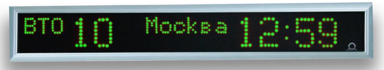 Матричное табло; односторонние; калибр: цифры - 57/30 мм, буквы - 30 мм; дальность распознавания символов 25 м; синхронизация DCF 77, IRIG-B, MOBALine и минутные импульсы 24 В; функции - время для 5 часовых поясов, дата (день недели, число, месяц) и температура воздуха; цвет символов - зеленый; питание 220 В AC; монтаж на стену; размеры 800x118x39 мм; вес 2,8 кг; алюминиевый корпус черного цвета IP40.