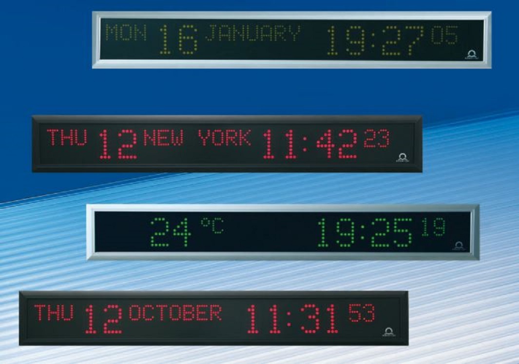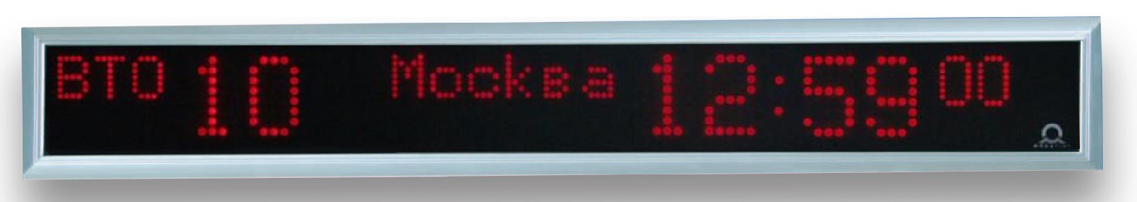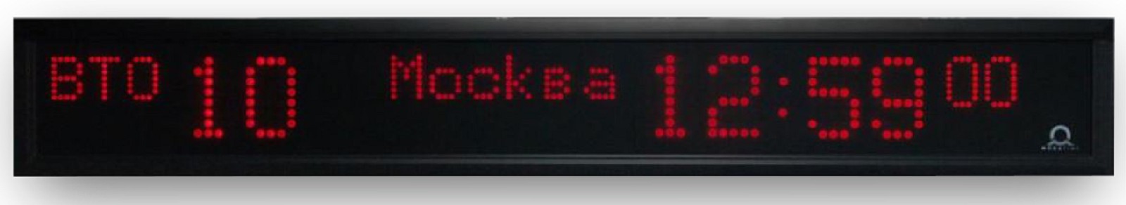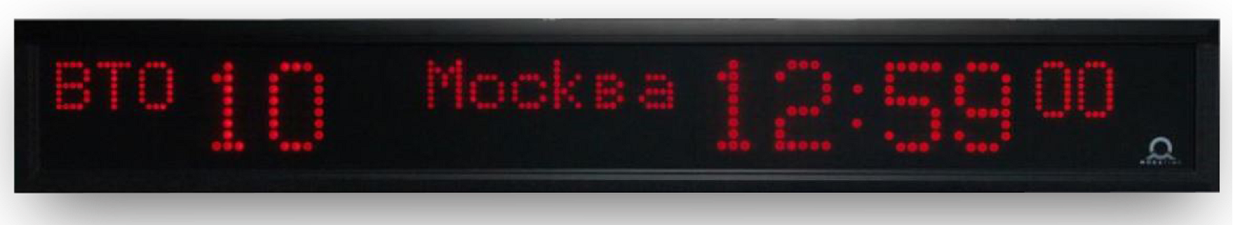 Матричное табло; односторонние; калибр: цифры - 57 мм, буквы - 30 мм; дальность распознавания символов 25 м; синхронизация DCF 77, IRIG-B, MOBALine и минутные импульсы 24 В; функции - время для 5 часовых поясов, дата (день недели, число, месяц) и температура воздуха; цвет символов - красный; питание 220 В AC; монтаж на стену; размеры 735x118x39 мм; вес 2,4 кг; алюминиевый корпус черного цвета IP40.