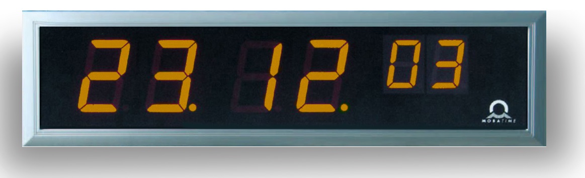Сегментное табло; 6 цифр - час/мин/сек; односторонние; высота цифр - 100/57 мм; дальность распознавания символов 40 м; синхронизация DCF 77, MOBALine и минутные импульсы 24 В; показ даты; время 12/24 ч; цвет цифр - желтый; питание 220 В AC; монтаж на стену; размеры 652x169x39 мм; вес 3,1 кг; алюминиевый корпус серого цвета IP40.